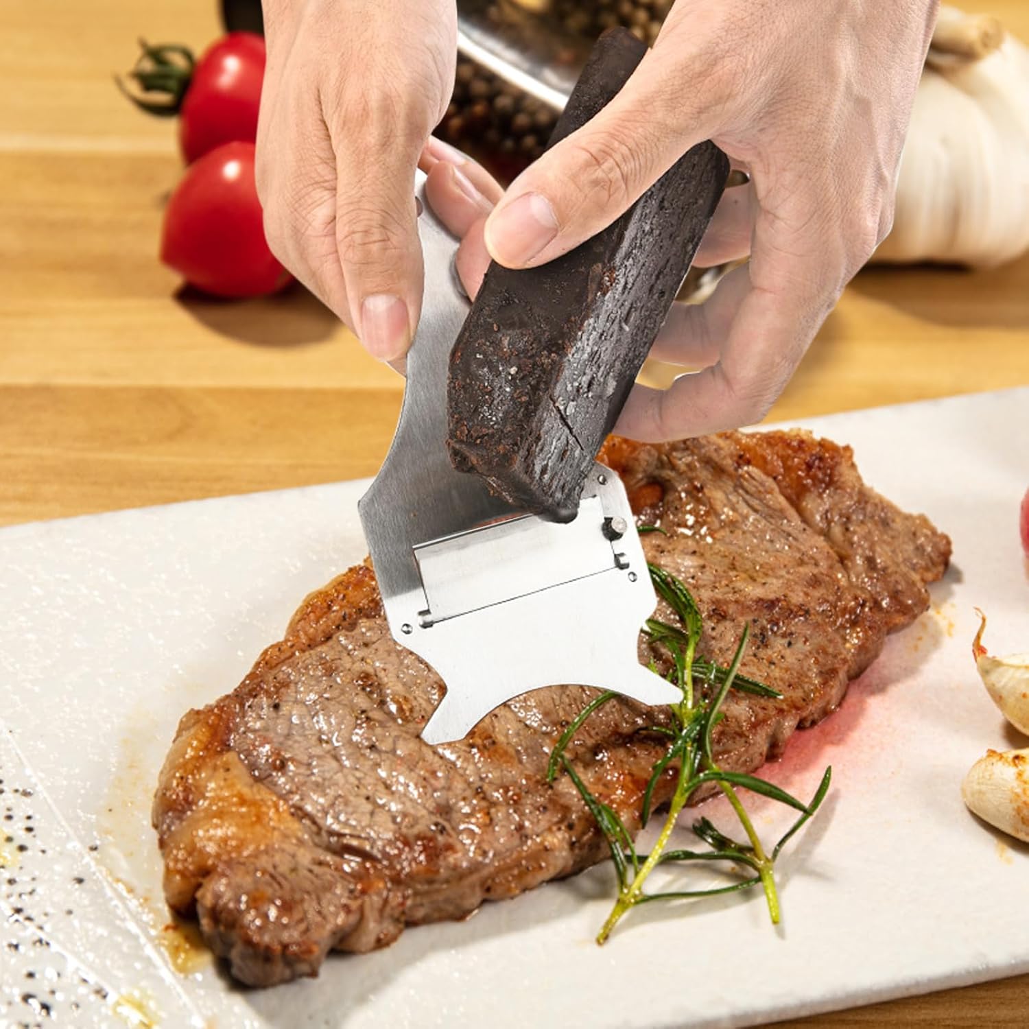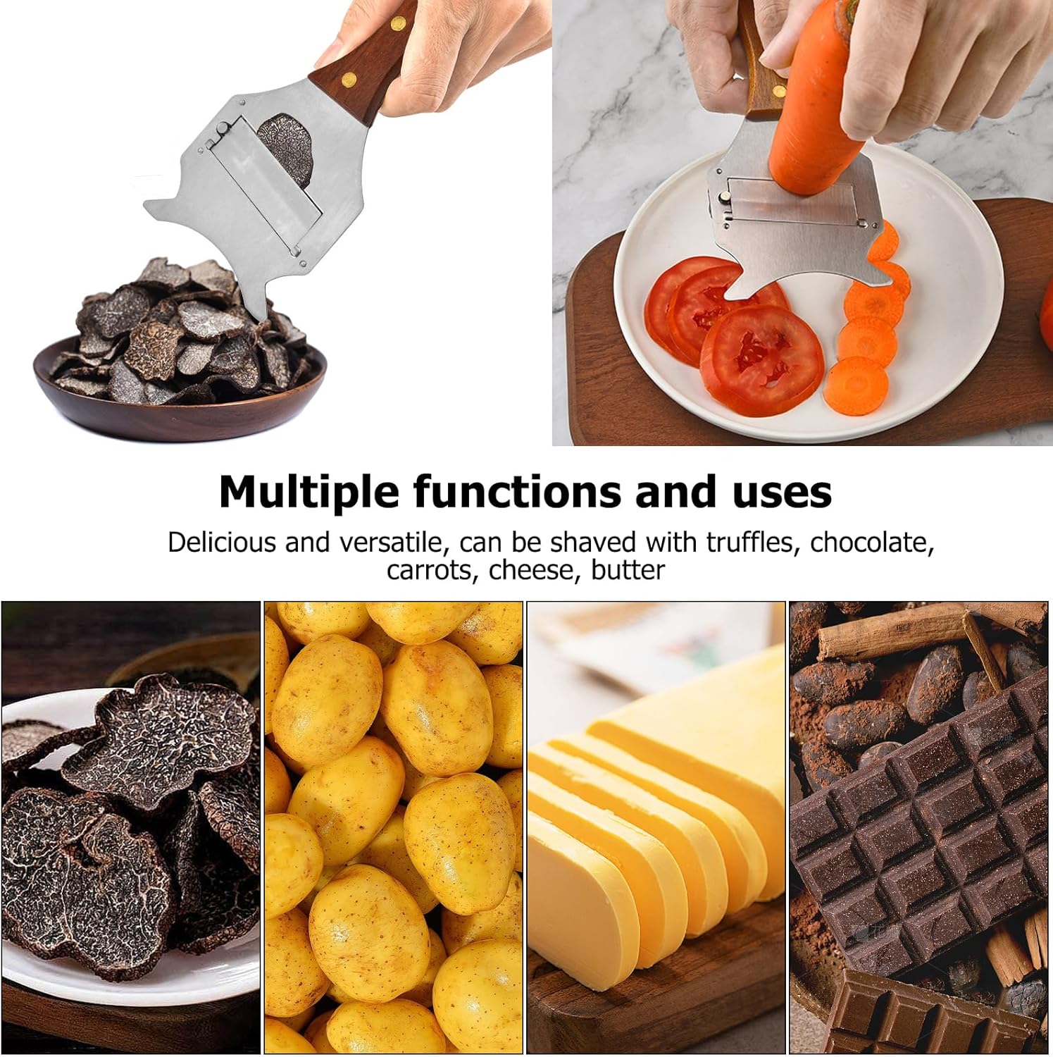 Този кухненски инструмент може да се използва за нарязване и настъргване на храни като трюфели, шоколад, сирене, гъби, чесън, зеленчуци, дебели моркови или тиквички и др.