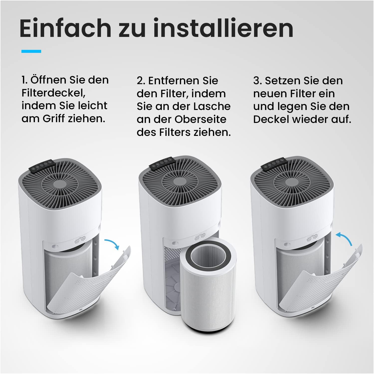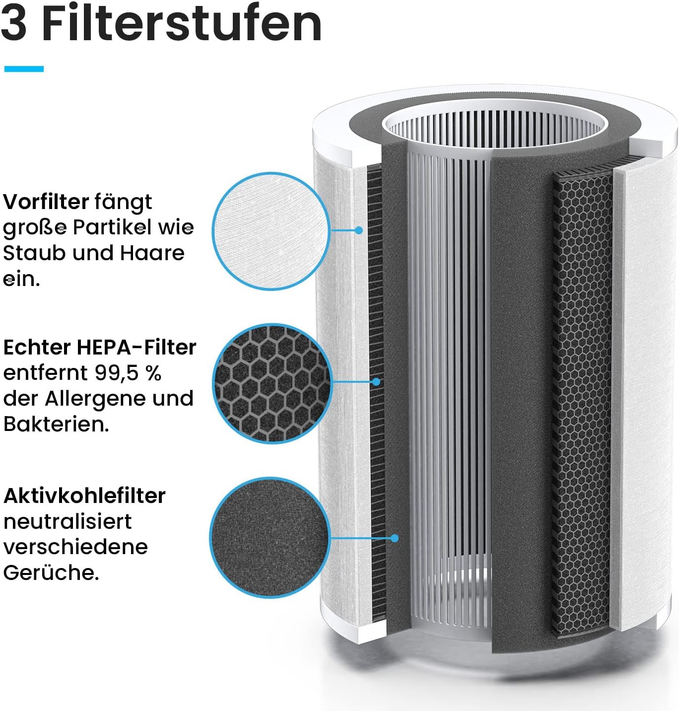 The effective Pro Breeze air purifier offers 3 filters: The pre-filter catches coarse particles, while the activated carbon filter removes unpleasant gases and odours. The true HEPA filter finally removes up to 99.5% of ultra-fine particles.