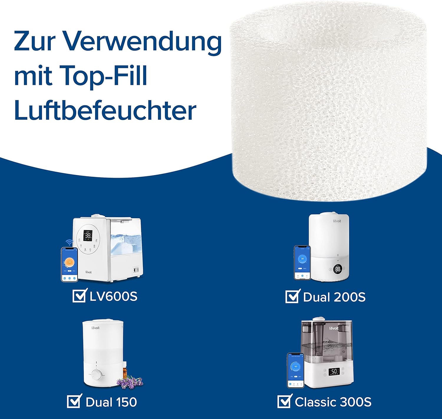 • Резервен филтър за овлажнител: Филтърът за овлажнител Levoit работи с ултразвукови овлажнители Levoit от серията модели LV600S / Dual 200S / Dual 150 / Classic 300 / Classic 300S / LV450S (Oasis Mist).