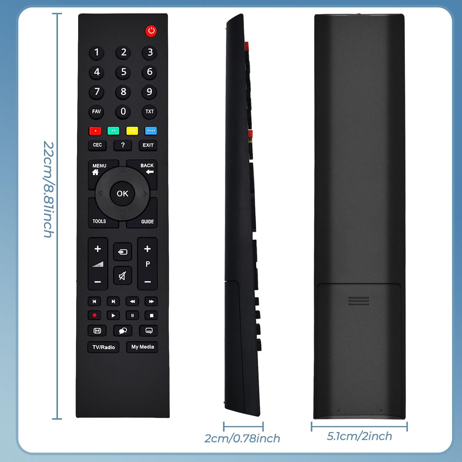 • 8 В 1 УНИВЕРСАЛНО ДИСТАНЦИОННО УПРАВЛЕНИЕ Това многофункционално универсално дистанционно управление може да управлява 8 различни типа устройства - всички телевизори, саундбари/аудио системи, системи за домашно кино, телевизори, DVD/Blu-ray плейъри, кабелни/сателитни системи, стрийминг медийни плейъри, цифрови приемници, HDTV, IPTV, DVB-T, цифрови телевизионни приемници, Freeview (UK), MP3 и други. То е съвместимо с всички марки телевизори и покрива всички функции на вашето старо, оригинално дистанционно за телевизор, така че може да бъде заменено безпроблемно.