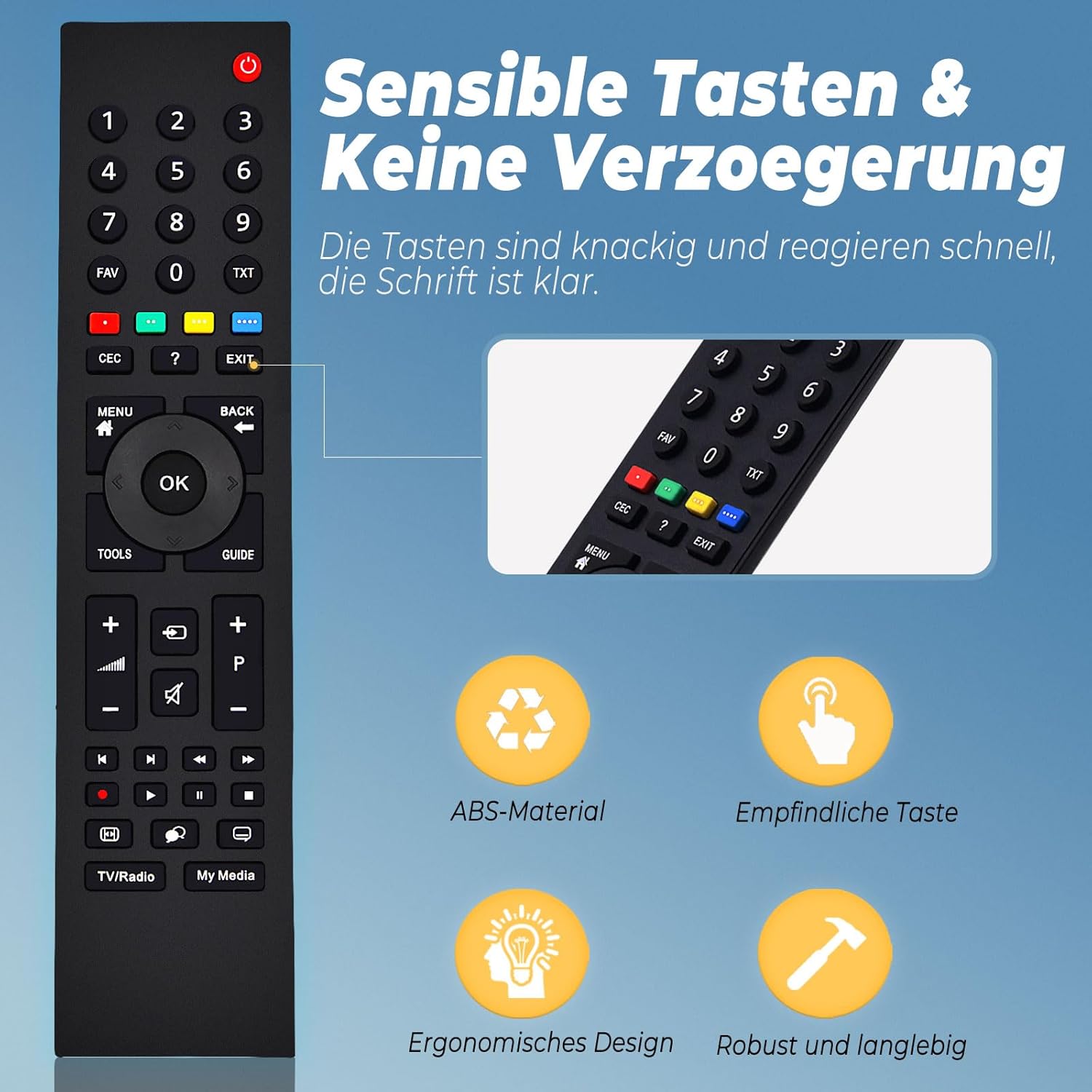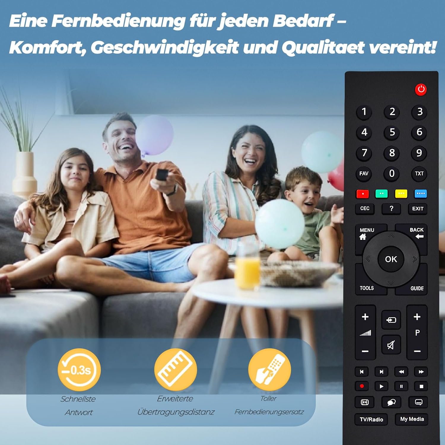 • ЧУВСТВИТЕЛНИ БУТОНИ И ОТЗИВ БЕЗ ОТКЛЮЧВАНЕ Всяко универсално дистанционно управление преминава през строги тестове, за да се гарантира оптимална производителност. Това дистанционно управление използва усъвършенствана инфрачервена технология и осигурява силен сигнал, светкавично бързо време за реакция (в рамките на 0,3 секунди) и голямо разстояние на предаване. Ултраширокият ъгъл на видимост позволява безпроблемна работа от различни ъгли, осигурявайки комфортно потребителско изживяване.