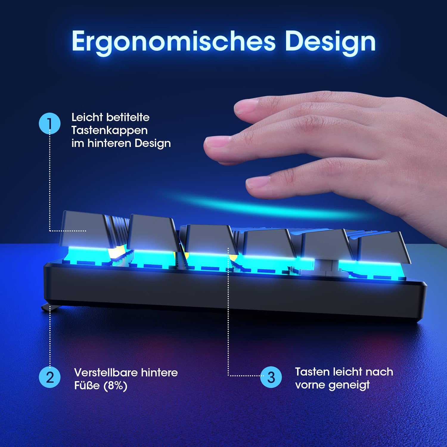 • ПОВИШЕН ЕРГОНОМИЧЕН КОМФОРТ Тази геймърска клавиатура е с научен дизайн на клавишите с стъпаловиден дизайн, който държи ръцете ви в най-естествено състояние, за да сведе до минимум умората в ръцете за дълго време. За да подобри стойката ви и да ви осигури по-голям комфорт по време на употреба, кабелната клавиатура се предлага с 2 здрави сгъваеми стойки на гърба, които позволяват накланянето ѝ. Освен това, клавиатурата е достатъчно неплъзгаща се, защото под нея има 4 гумени подложки.