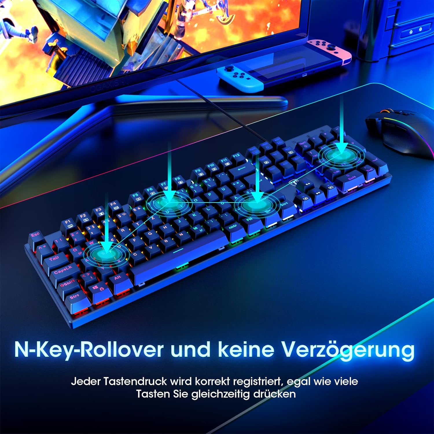 • 【МЕХАНИЧНА КЛАВИАТУРА】: Сини превключватели с бърза реакция: Клавиатурата RisoPhy има щракащи клавиши, които ви осигуряват по-висока точност и по-бърза реакция с приятен звук на щракане при писане. Тази клавиатура е по-удобна за писане, тъй като предлага по-дълбок ход на клавишите, повече обратна връзка и повече пространство между тях. За тези, които предпочитат клавиатури с по-тактилно усещане и „щракащо“ усещане, нашата синя клавиатура с превключватели е добър избор.