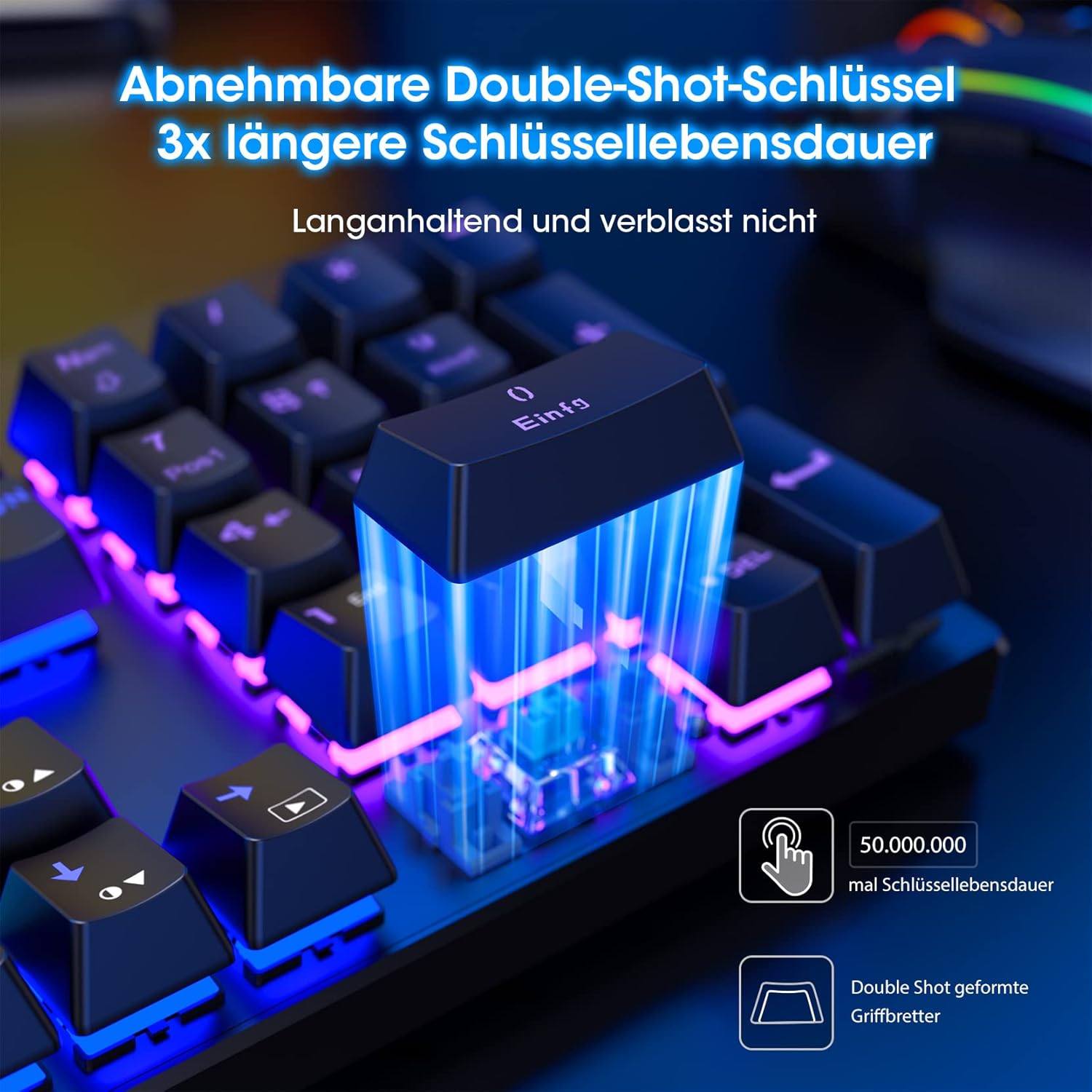 • 【МЕХАНИЧНА КЛАВИАТУРА】: Сини превключватели с бърза реакция: Клавиатурата RisoPhy има щракащи клавиши, които ви осигуряват по-висока точност и по-бърза реакция с приятен звук на щракане при писане. Тази клавиатура е по-удобна за писане, тъй като предлага по-дълбок ход на клавишите, повече обратна връзка и повече пространство между тях. За тези, които предпочитат клавиатури с по-тактилно усещане и „щракащо“ усещане, нашата синя клавиатура с превключватели е добър избор.