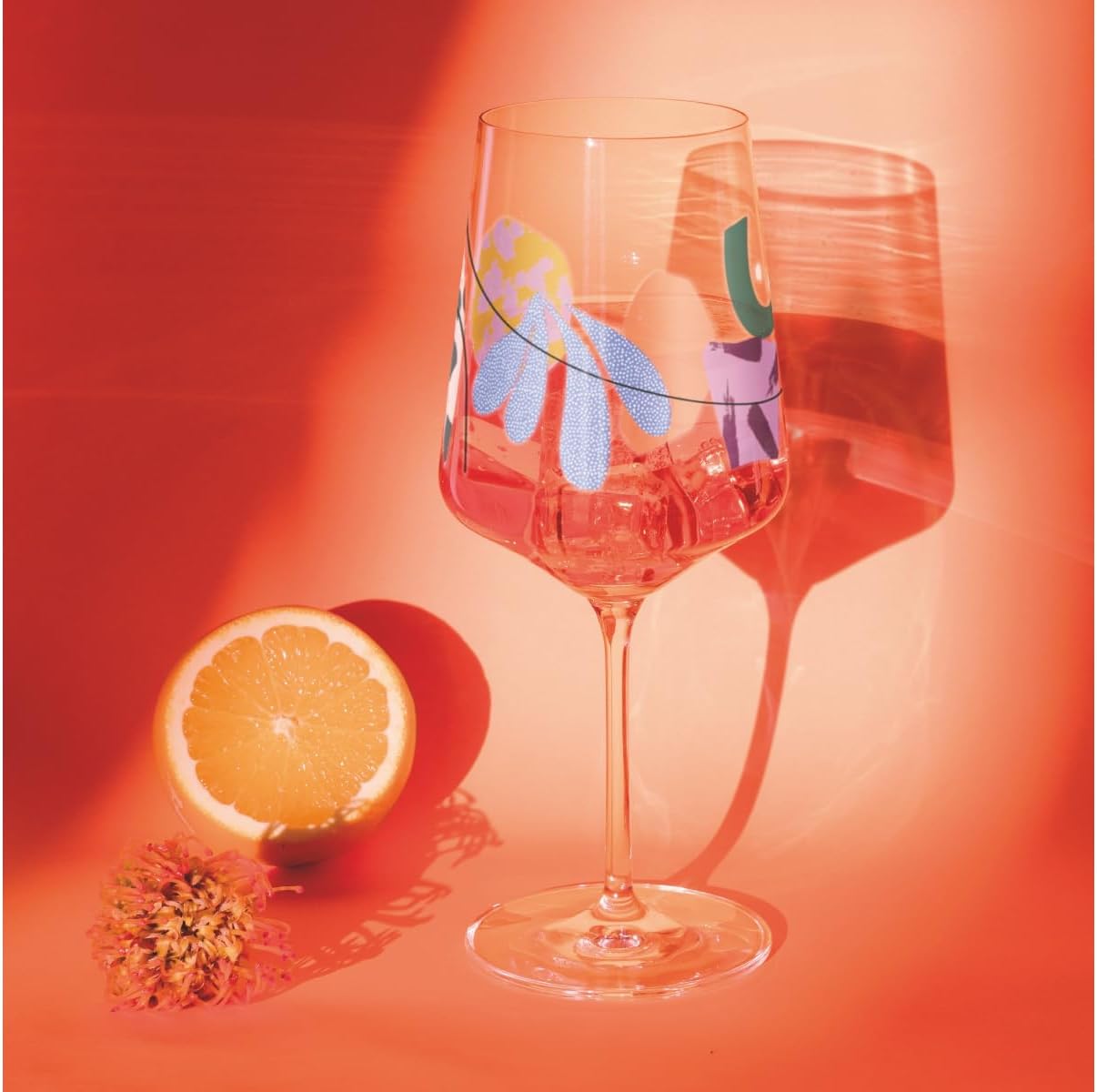 • Дизайн – Тази атрактивна чаша блести с цветна декорация. Размерите ѝ са 22,5 см височина, 9,3 см диаметър и тежи 220 г. Идеална за Aperol Spritz или коктейли от 0,5 л.
