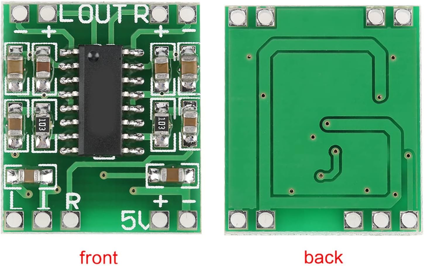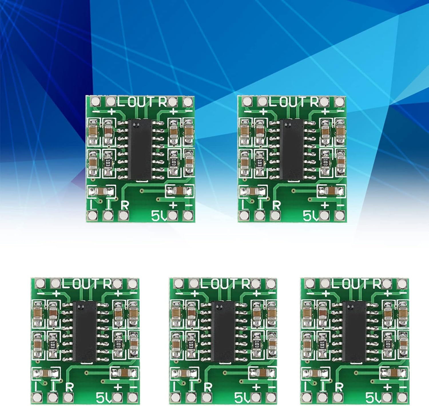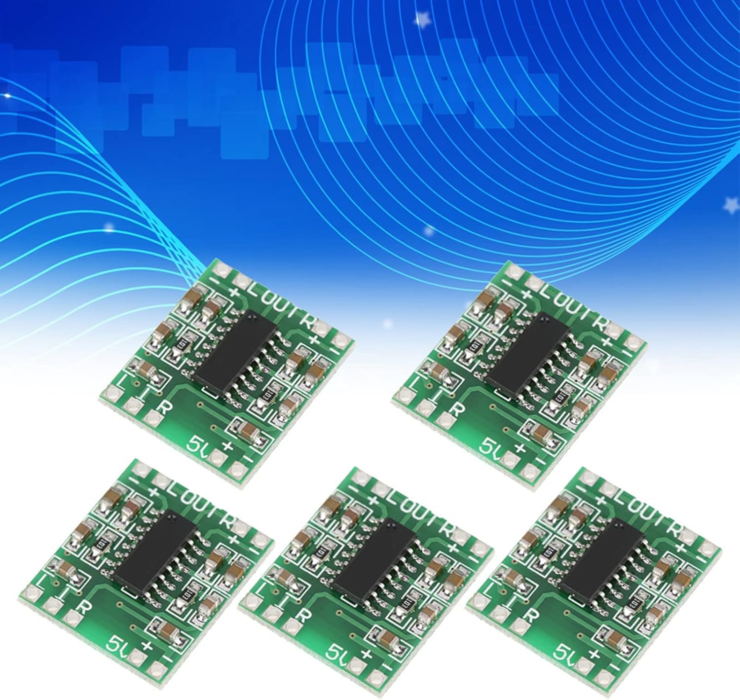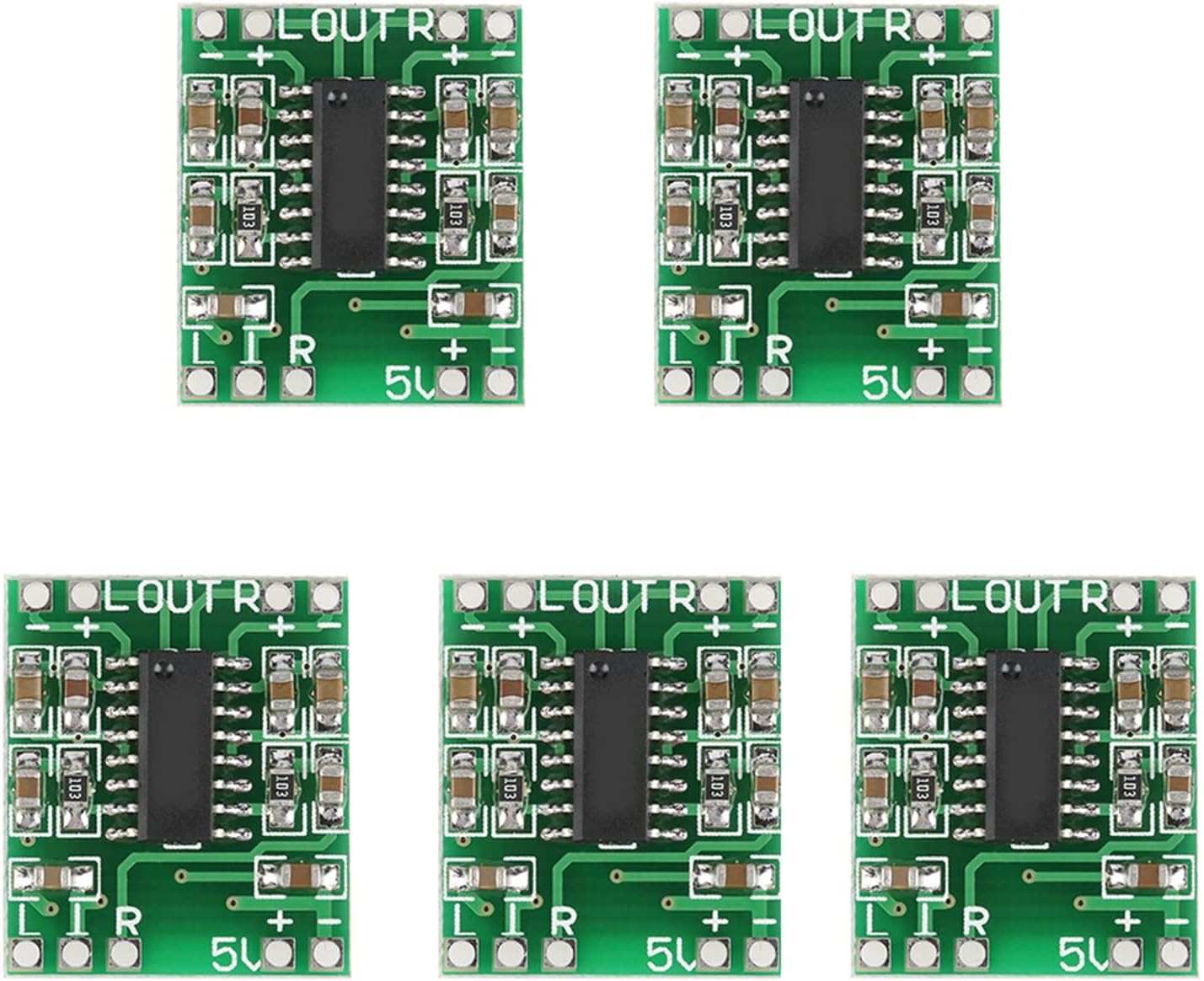 Riuulity PAM8403 Мини цифров усилвател на мощност, 5 бр., 3W + 3W аудио усилвателен модул за LCD телевизори, монитори, телефони с верига за намаляване на шума, лек и компактен