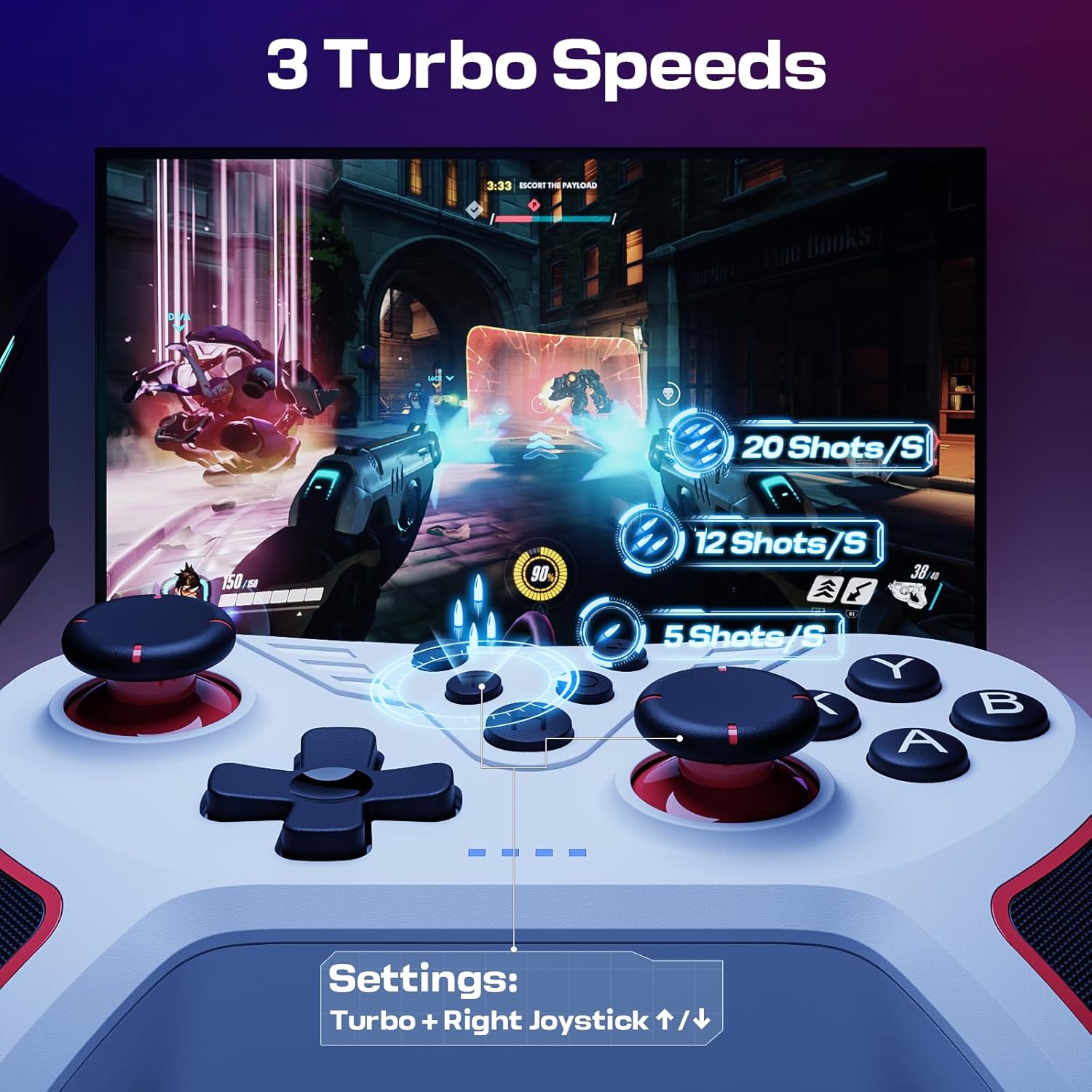 • ТУРБО ФУНКЦИЯ ЗА БЪРЗО ДЕЙСТВИЕ Доминирайте над конкуренцията с турбо функцията, която предлага три настройки за скорост с 5, 12 или 20 натискания в секунда. Идеална за вашия PC геймпад.