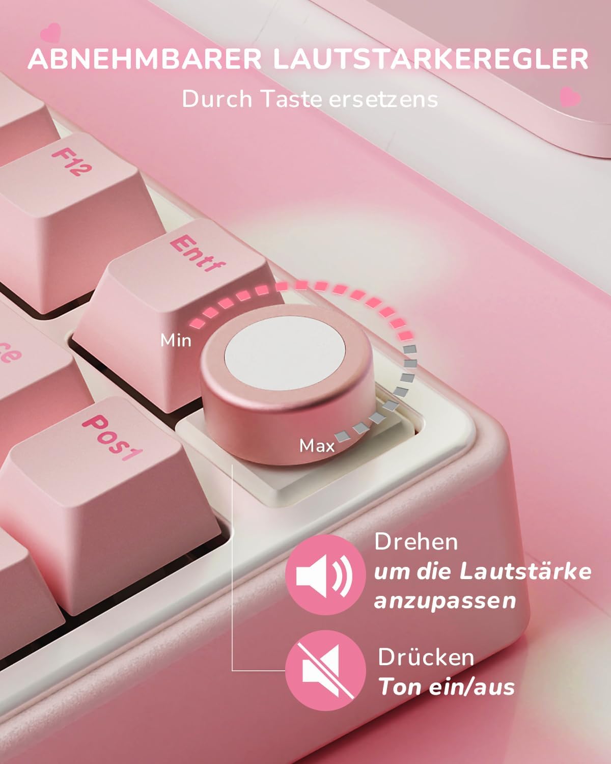 • CNC метален бутон за сила на звука: 75% от геймърската клавиатура има CNC метален бутон. Чрез завъртане и натискане можете да регулирате силата на звука и функцията за изключване на звука. Бутонът е взаимозаменяем и програмируем в движение и можете да го замените с включените кремави превключватели и капачки за клавиши. Независимо дали го използвате за управление на мултимедия или като персонализирани бутони, той може да отговори на вашите изисквания.