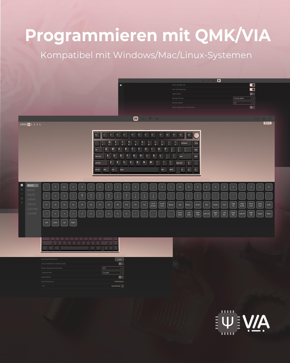• RGB и QMK/VIA: RGB клавиатурата може да избира от повече от 20 вградени режима на подсветка чрез клавишни комбинации, включително динамични RGB ефекти, монохромни и пълноцветни режими, като 16 милиона RGB цветови режима са регулируеми. Клавиатурата TKL поддържа програмируем QMK/VIA, система с отворен код, проектирана специално за клавиатури и предлагаща по-цялостни опции за персонализиране и редактиране от традиционния софтуер. Можете да персонализирате подредби на клавиатурата, макро клавиши, ефекти на подсветката и други.