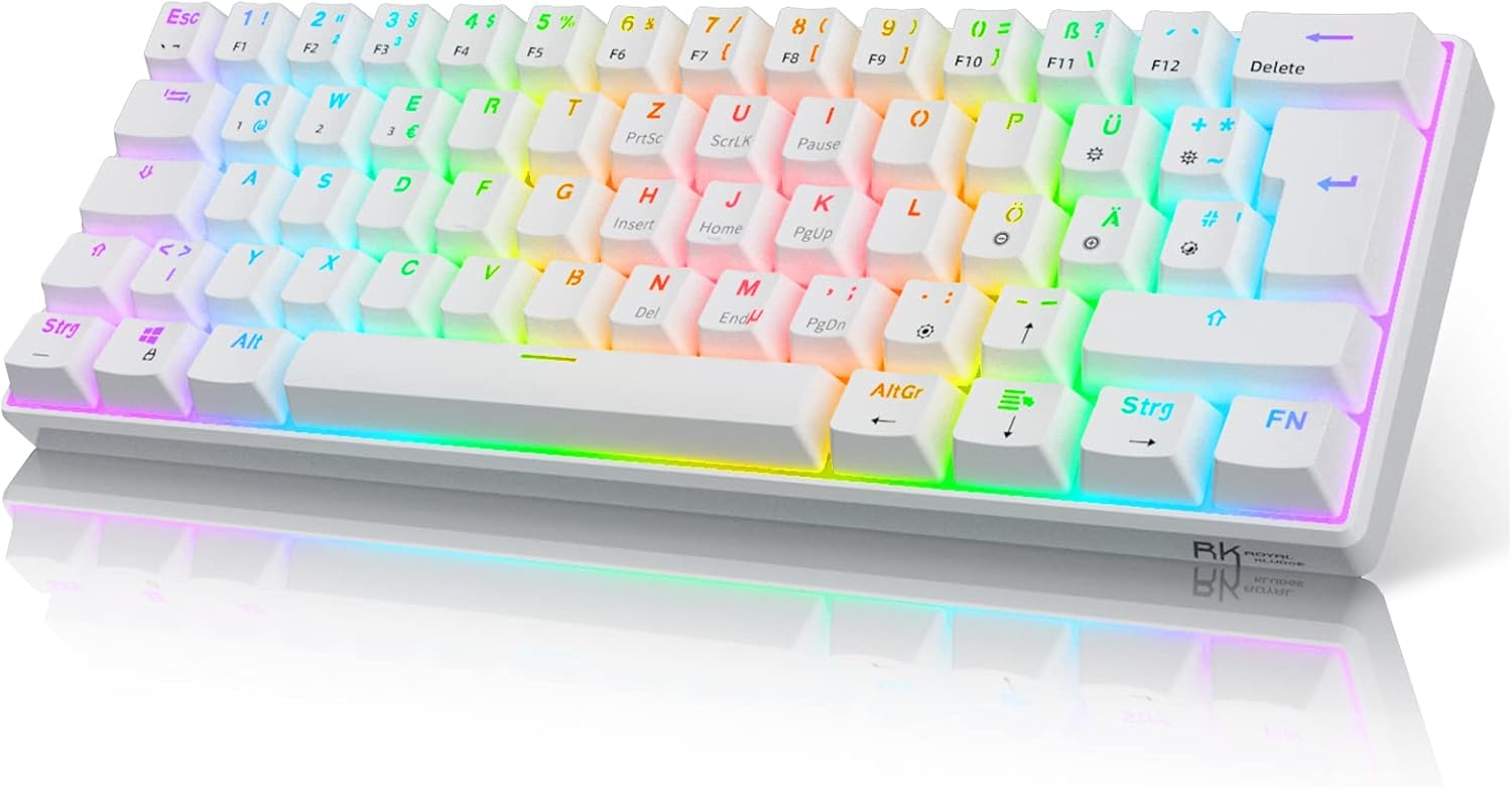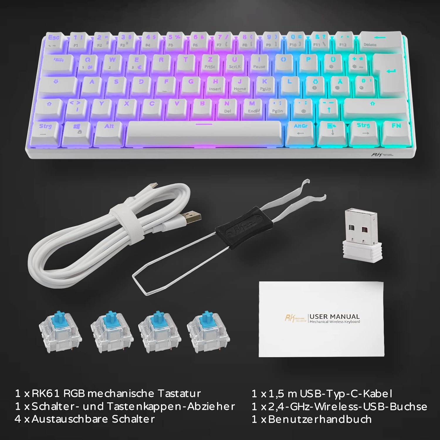 RK ROYAL KLUDGE RK61 RGB 60% механична геймърска клавиатура, безжична/кабелна Bluetooth клавиатура с Hot Swap, син щракащ превключвател, съвместима с множество устройства, бяла (QWERTZ)