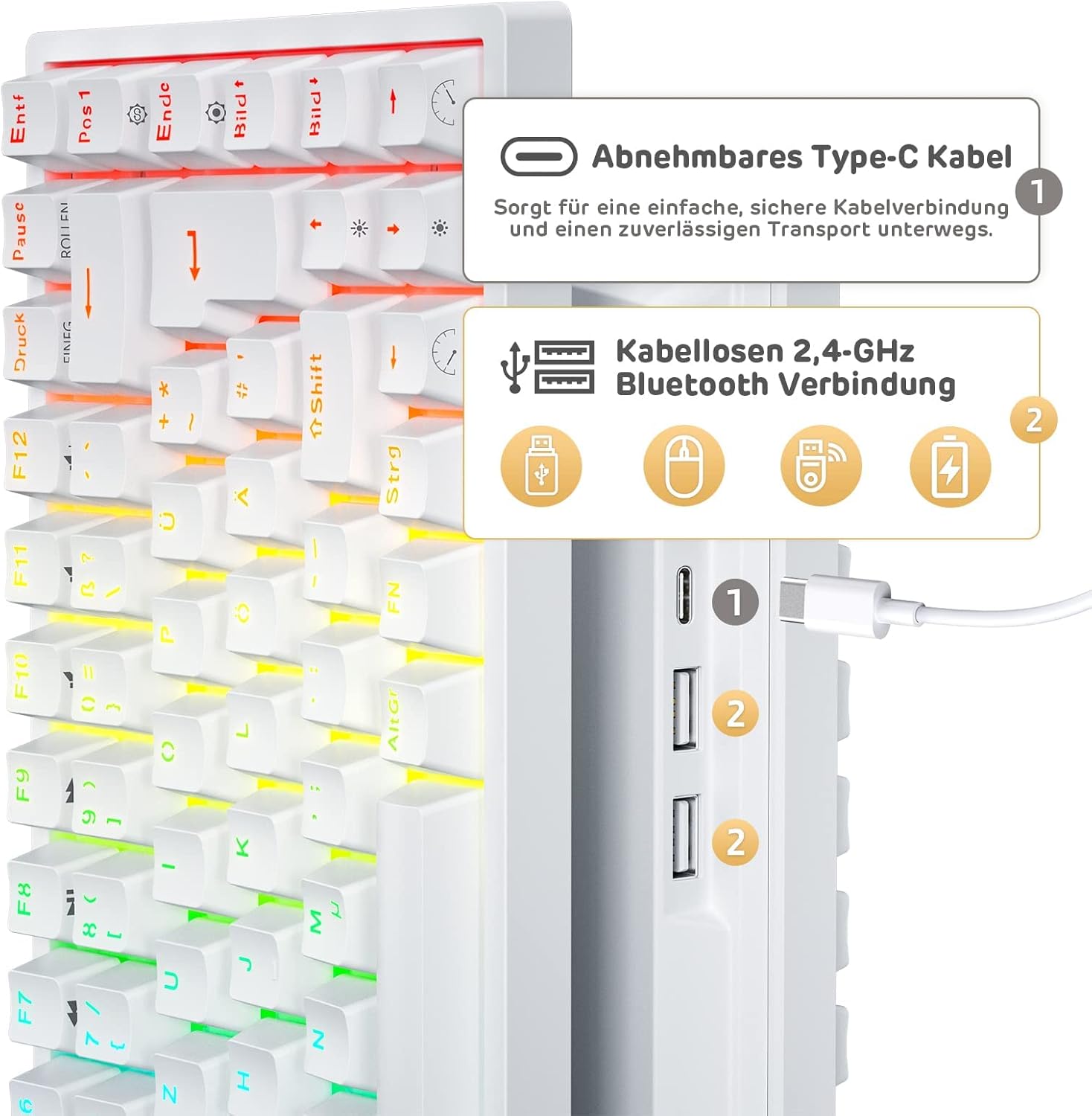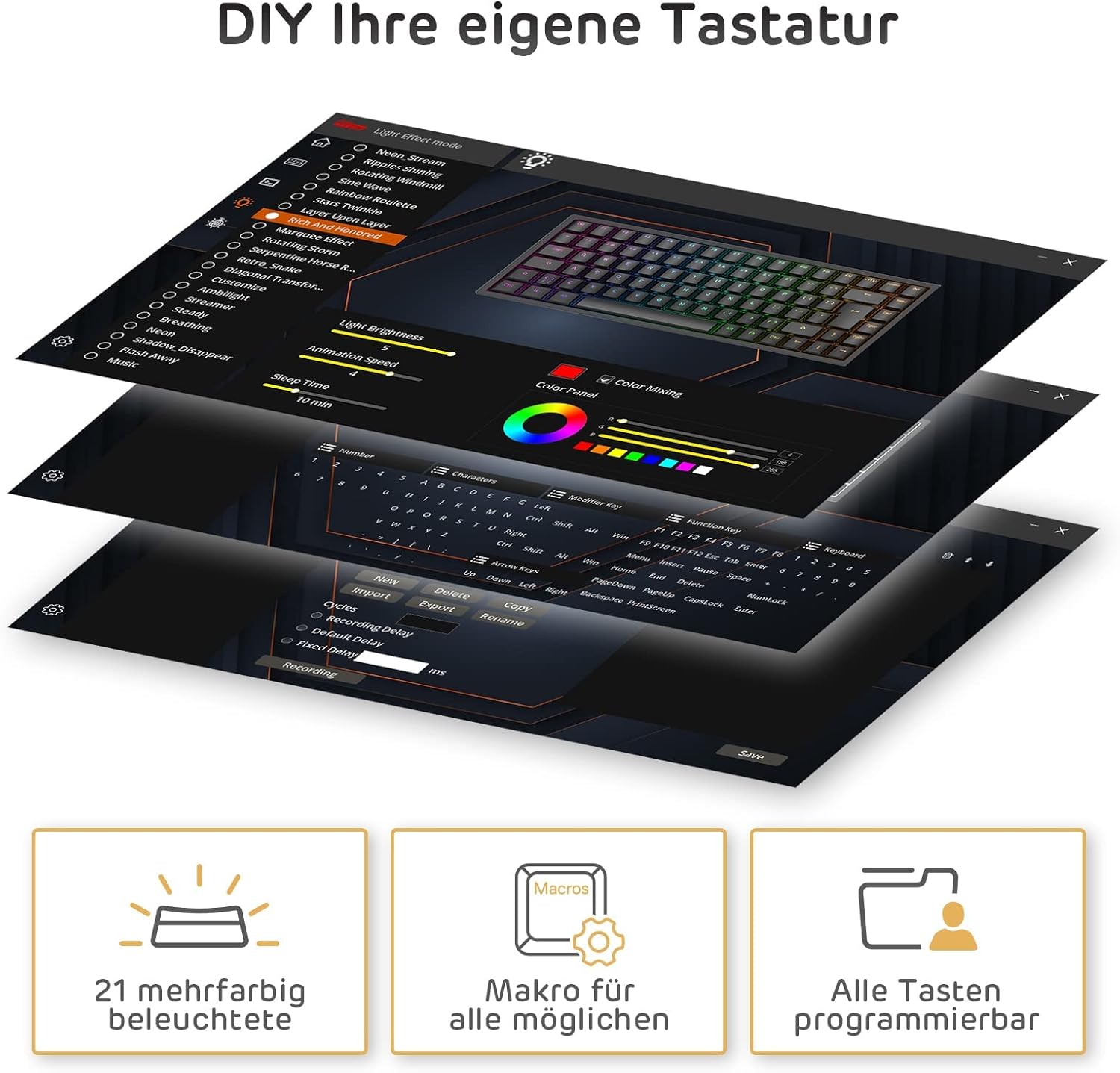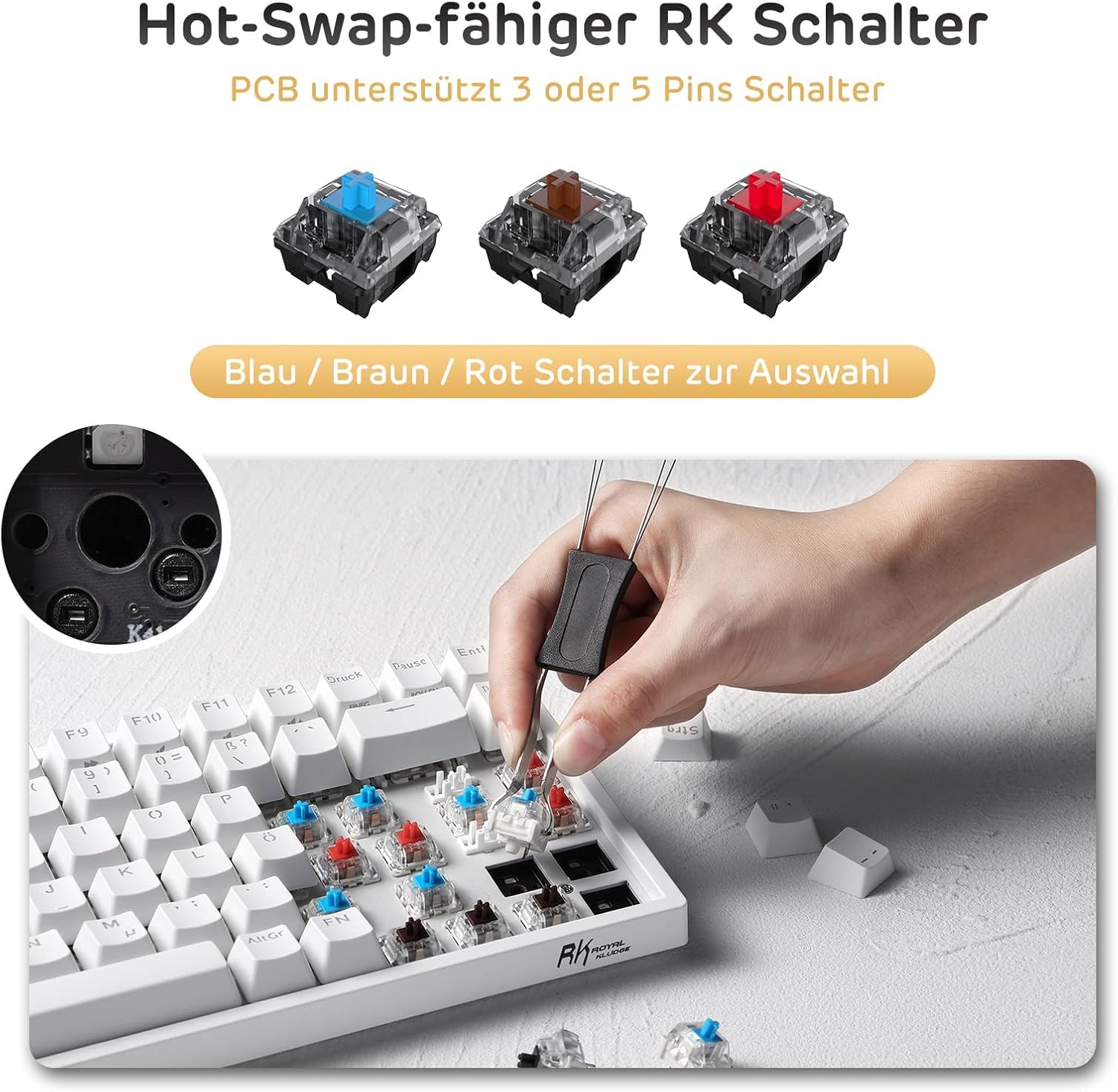 RK ROYAL KLUDGE RK84-DE 75% геймърска клавиатура, 85 клавиша компактна TKL клавиатура, Bluetooth механична клавиатура, червен превключвател, RGB подсветка, 2.4 GHz геймърска клавиатура за Mac и Win, QWERTZ