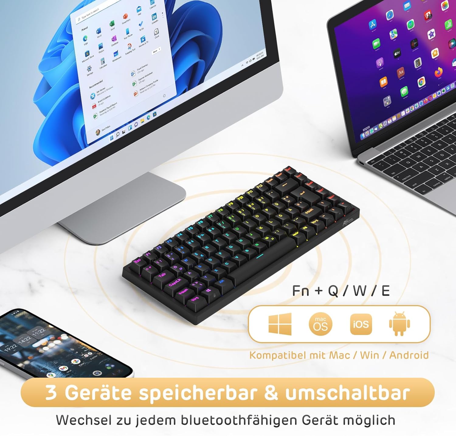 RK ROYAL KLUDGE RK84-DE 75% Геймърска клавиатура, 85 клавиша TKL клавиатура, Bluetooth механична клавиатура, червен превключвател, RGB подсветка, 2.4 GHz геймърска клавиатура за Mac и Windows, черна, QWERTZ