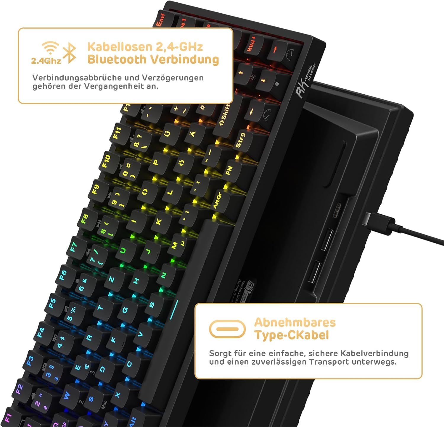 RK ROYAL KLUDGE RK84-DE 75% Геймърска клавиатура, компактна клавиатура с 85 клавиша, Bluetooth механична клавиатура, сини превключватели, RGB подсветка, 2.4 GHz геймърска клавиатура за Mac и Win, QWERTZ