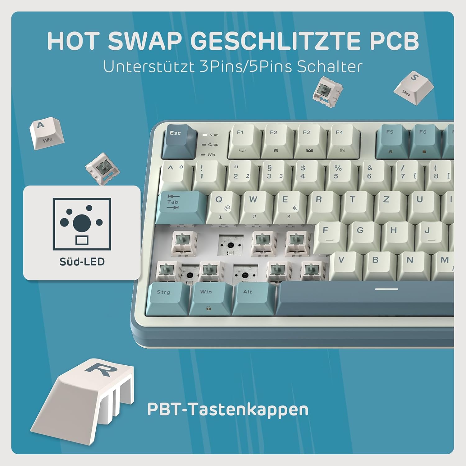 • Механична клавиатура с възможност за гореща смяна - Печатната платка с възможност за гореща смяна ви позволява да превключвате 3-пинови/5-пинови превключватели без проблеми с запояването. Насладете се на забавлението от създаването на ваша собствена уникална клавиатура.