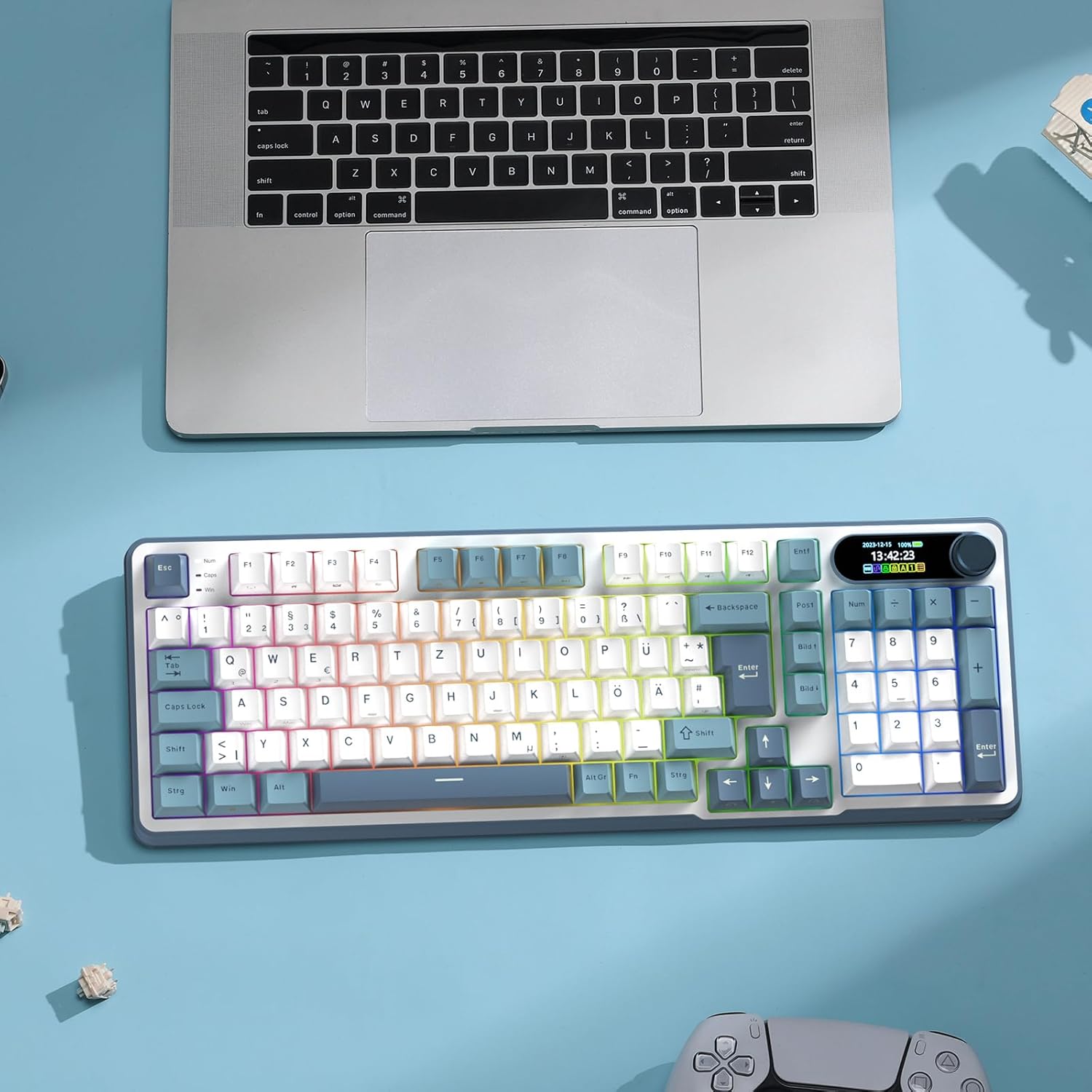 RK ROYAL KLUDGE S98 DE Механична клавиатура с интелигентен дисплей и бутони, монтаж отгоре, 96% безжична механична клавиатура BT/2.4G/USB-C, възможност за гореща замяна, софтуерна поддръжка, 98 клавиша, QWERTZ