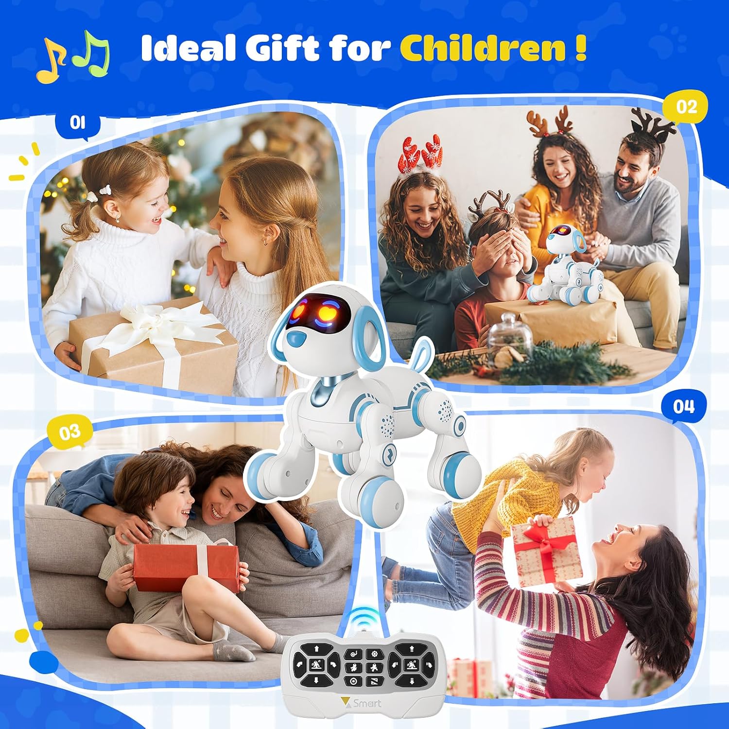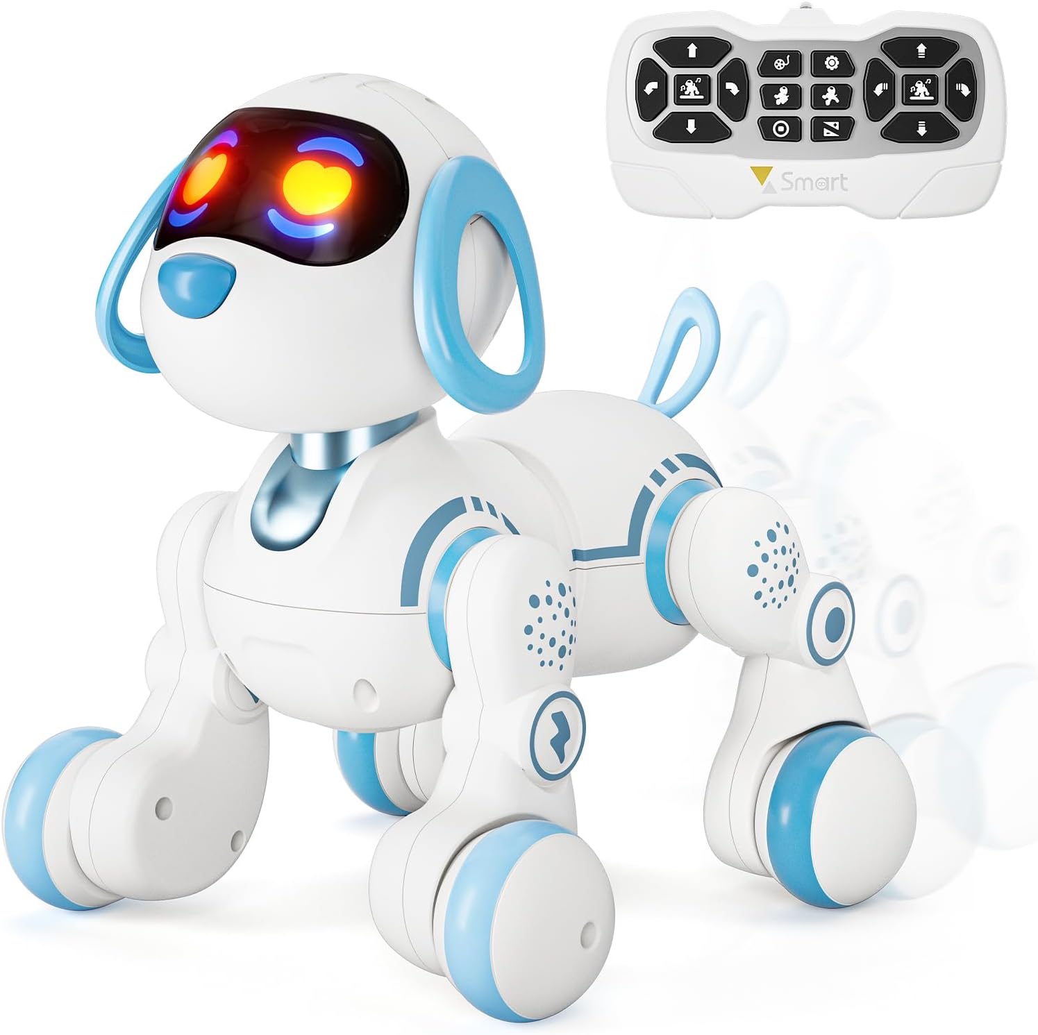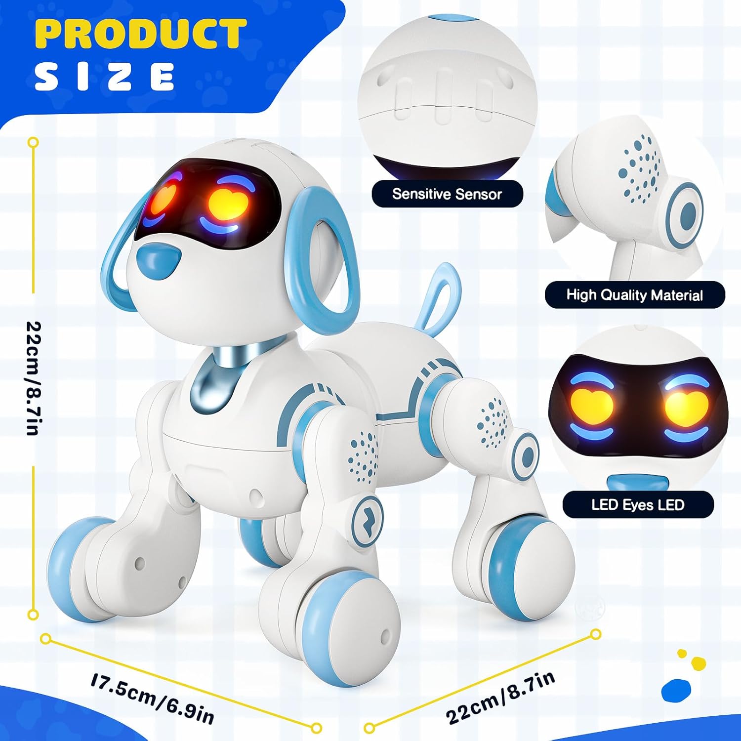 • Интелигентно куче робот за деца: Супер сладко куче робот, което можете да контролирате. То издава реалистични кучешки звуци и свети с очите си. Може да изпълнява каскади, трикове и танци на забавни звуци и музика. Можете дори да го програмирате да изпълнява серия от забавни движения.