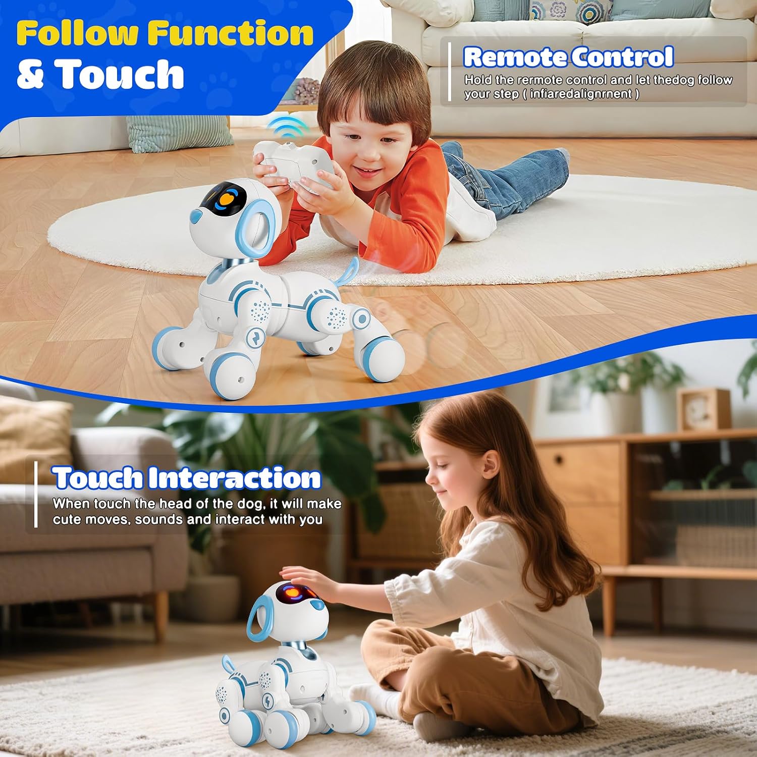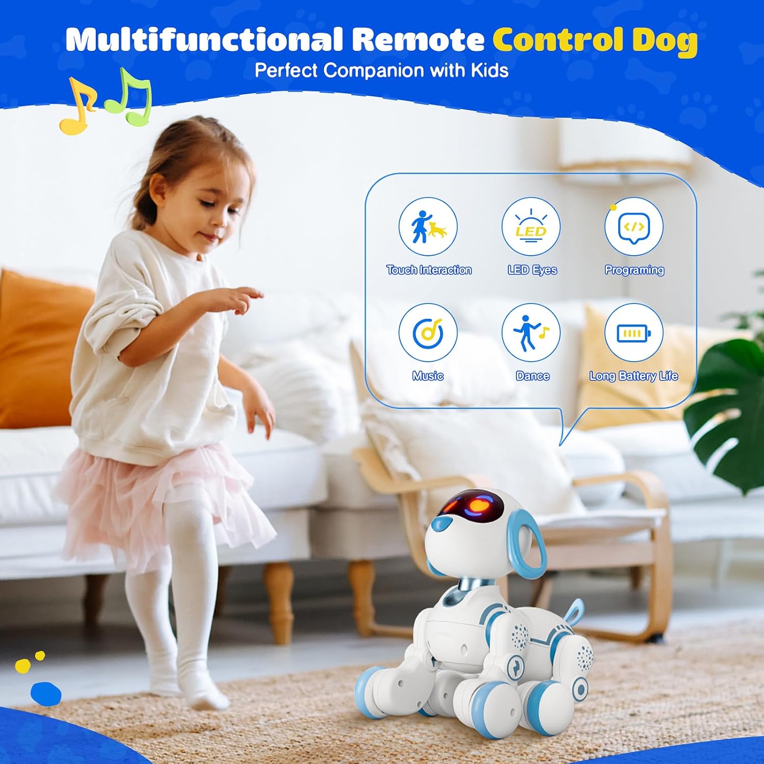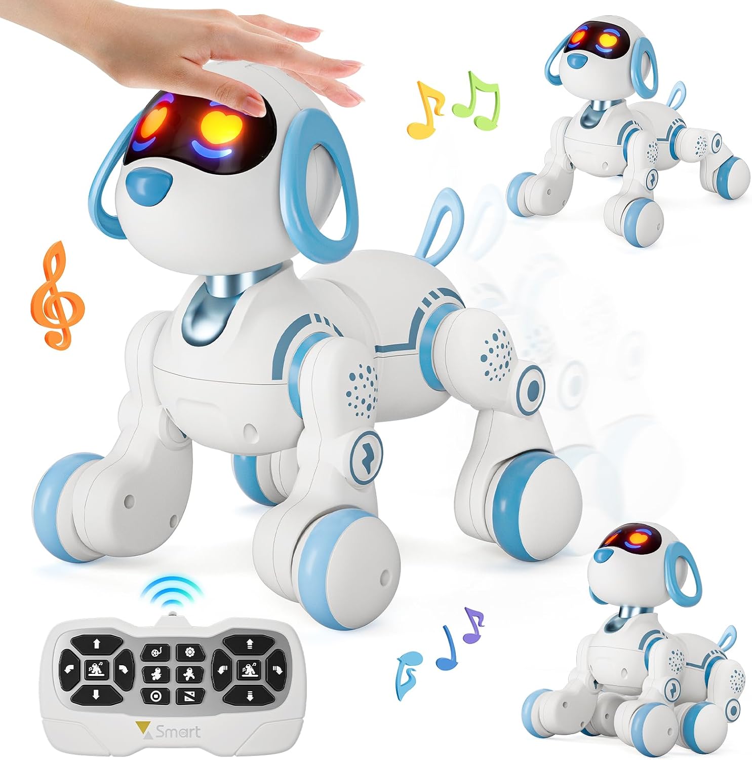 • Интелигентно куче робот за деца: Супер сладко куче робот, което можете да контролирате. То издава реалистични кучешки звуци и свети с очите си. Може да изпълнява каскади, трикове и танци на забавни звуци и музика. Можете дори да го програмирате да изпълнява серия от забавни движения.