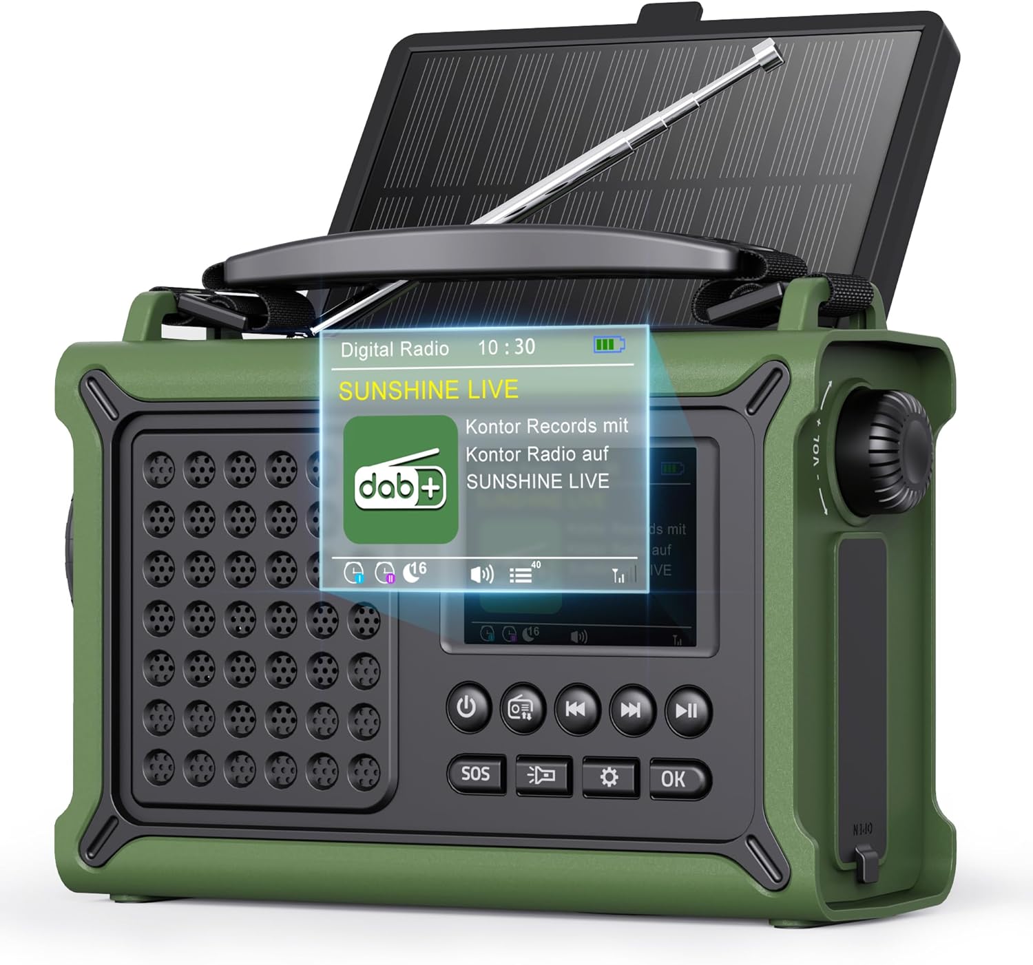 ROCAM радиостанция DAB+/FM, преносима аварийна радиостанция 12000 mAh със соларен панел 8500 mm² и 650 mA ток, цифрово радио с Bluetooth, 2.4-инчов цветен дисплей, 80 предавателя, SOS, LED фенерче, USB