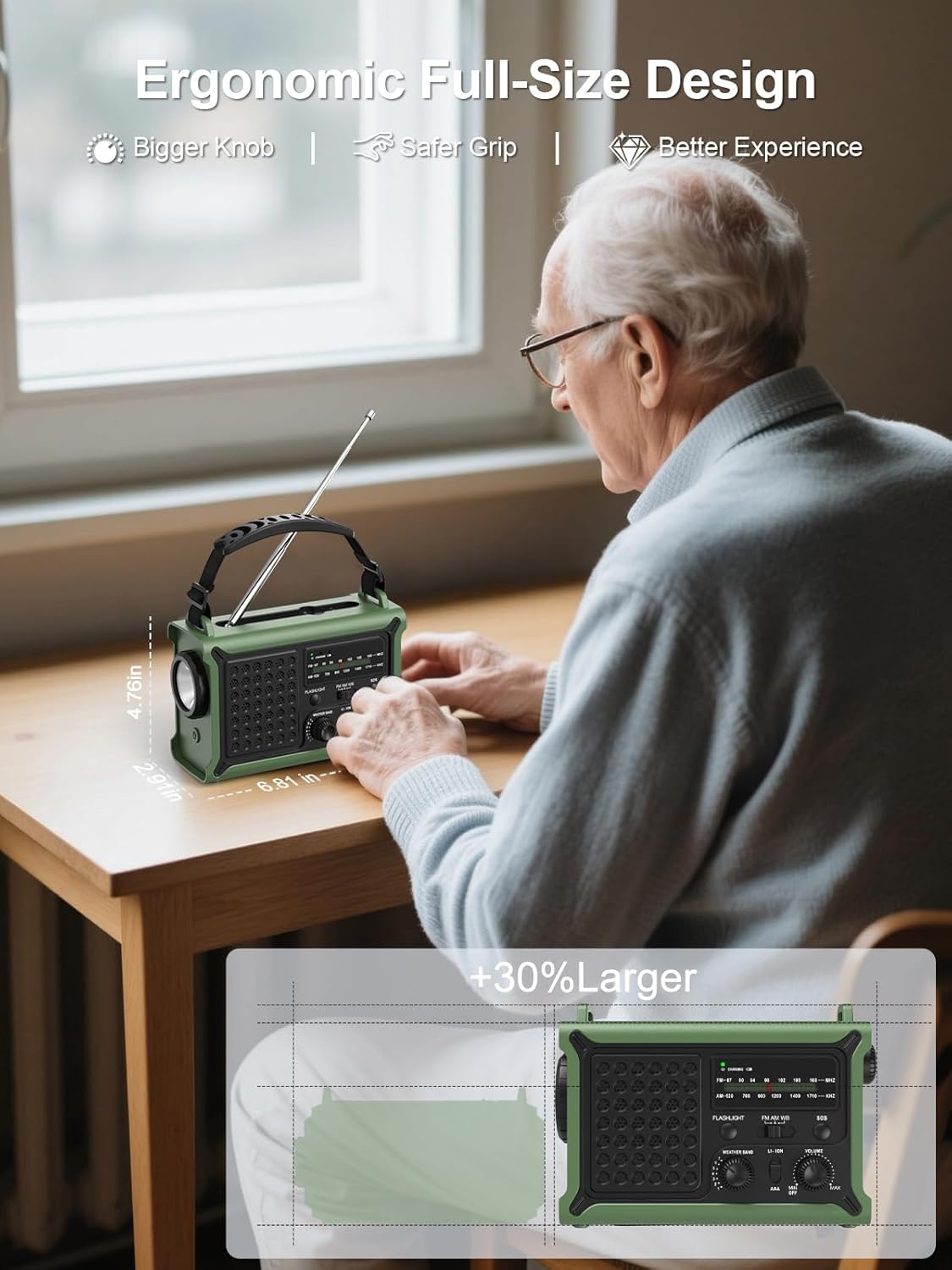 • Удобен за употреба: с 30% по-голям от конвенционалните модели за по-добър захват. Голямото копче и неплъзгащият се корпус правят това радио с батерии особено лесно за употреба - дори за възрастни хора или носещи ръкавици.