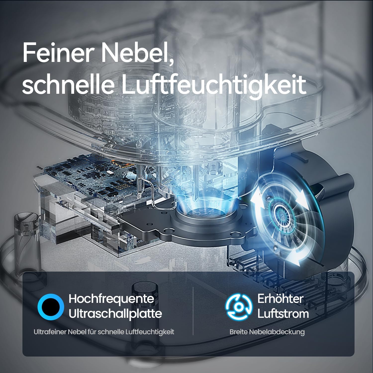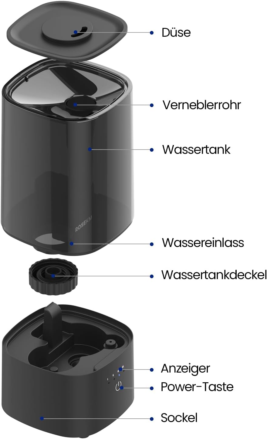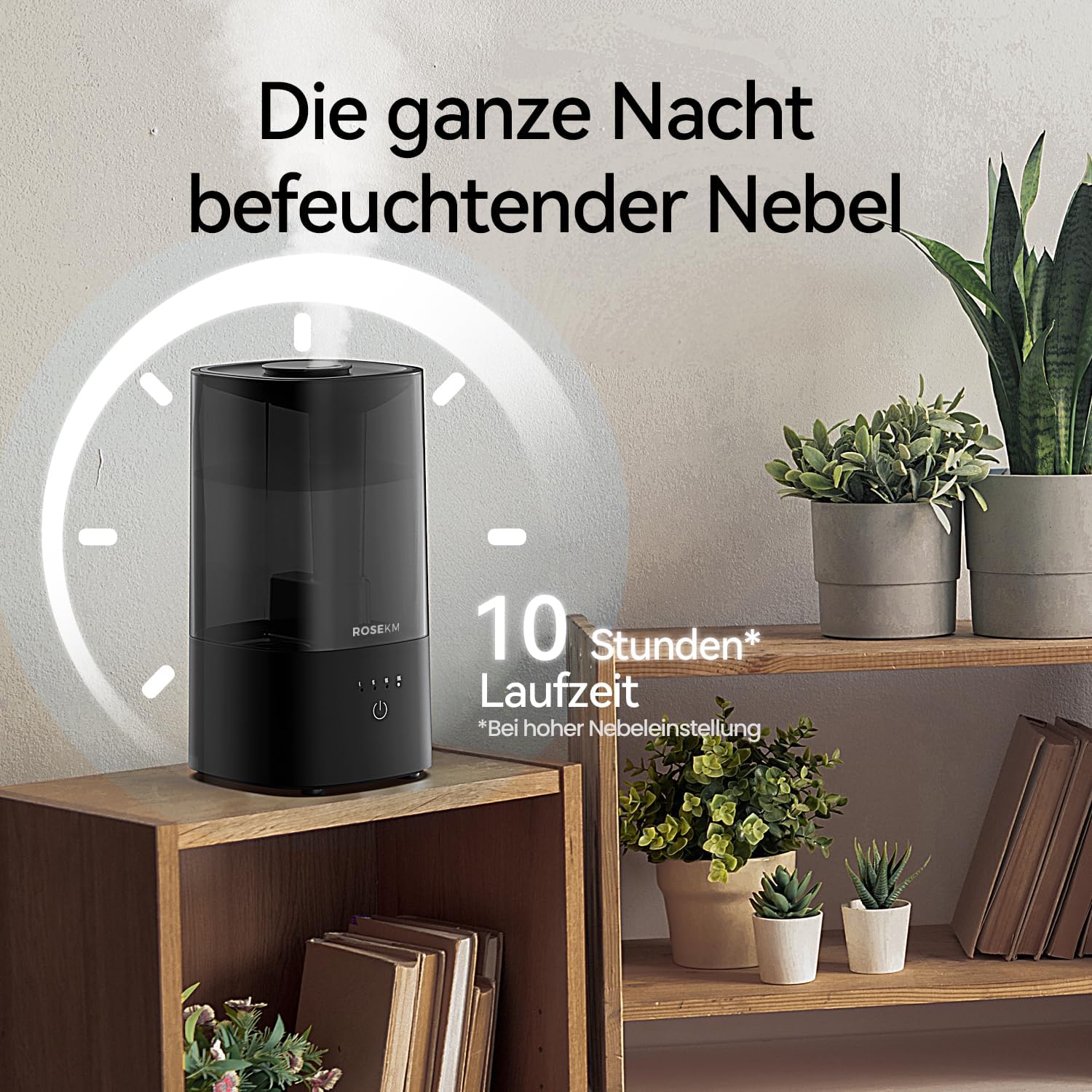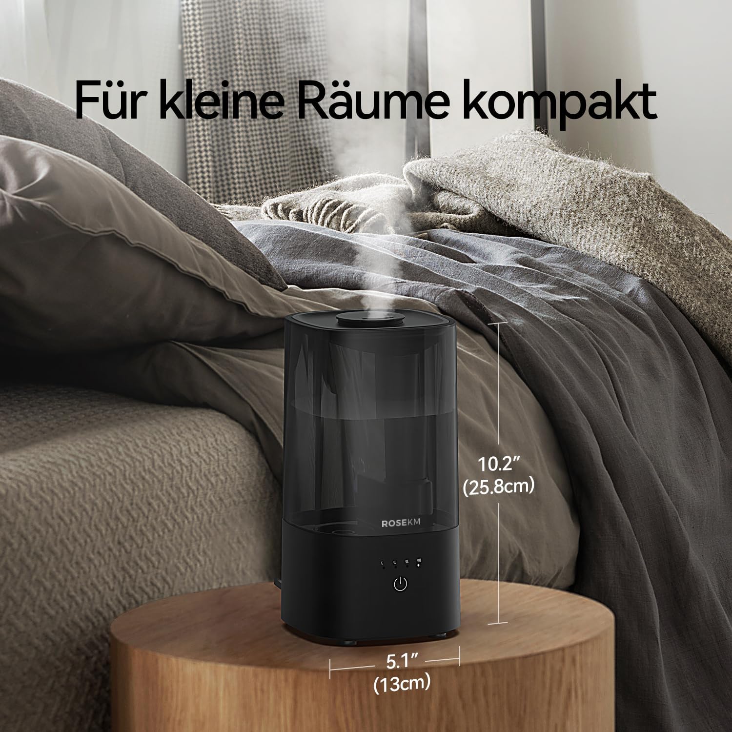 Roeskm Овлажнител за спалня, Охлаждащ овлажнител с мъгла за дома, растенията и бебешката стая, Тих ултразвуков с 360° дюза, Автоматично изключване, Без филтър, Черен