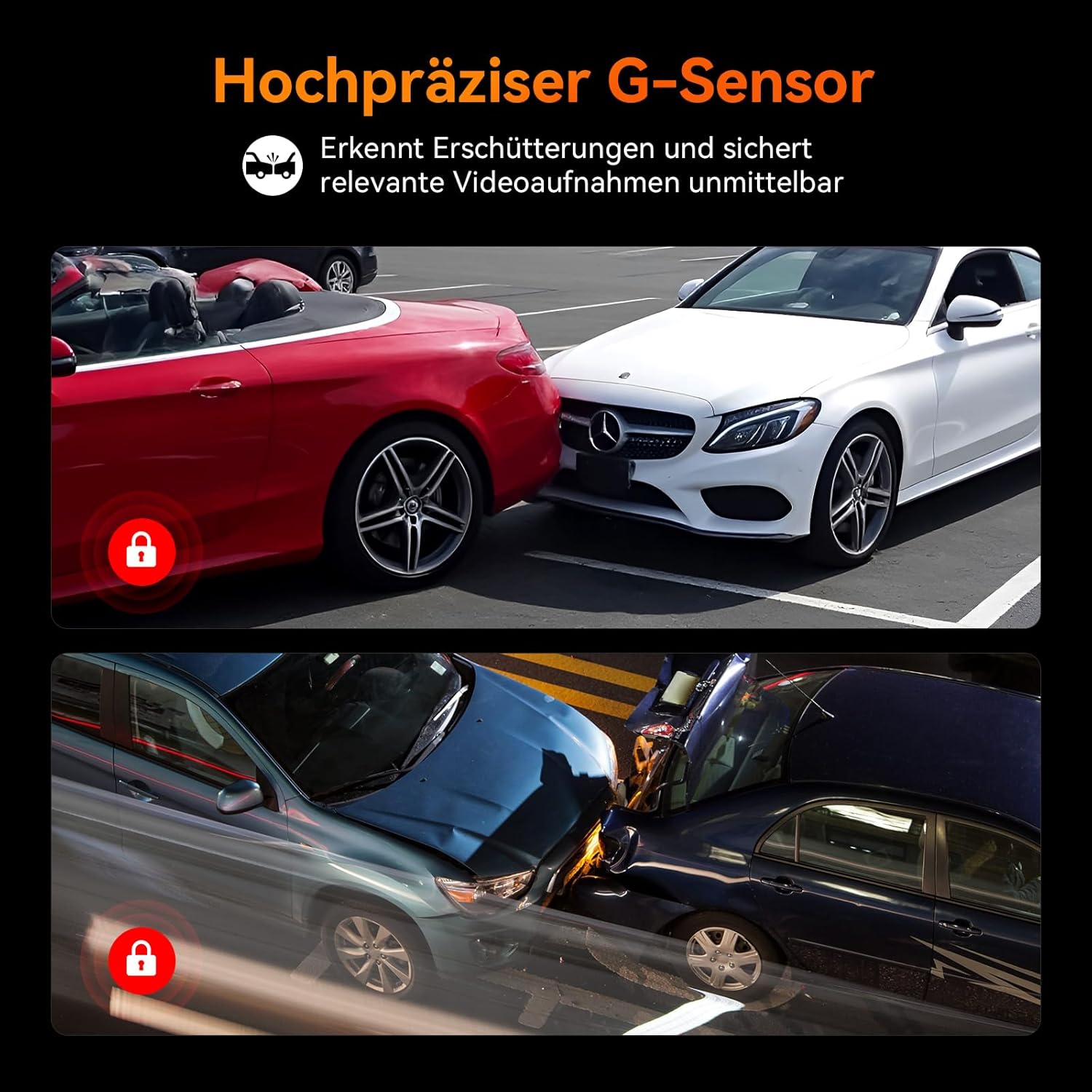• Надеждност: Вграденият сензор за движение GSensor автоматично задейства авариен запис в случай на сблъсък. Тези записи могат да бъдат използвани като правно допустими видео доказателства в случай на спор.