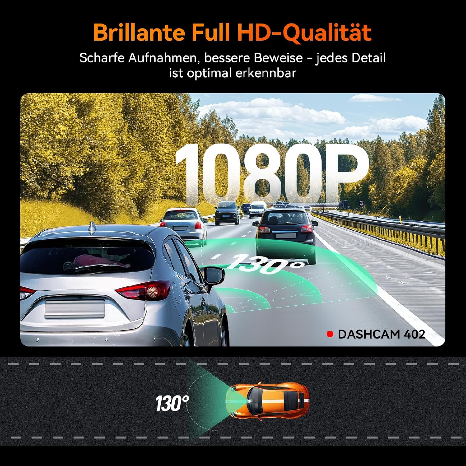 • Ясни изображения: Широкоъгълен обектив със 125° ъгъл на видимост и 2,9-инчов CMOS сензор за изображения с Full HD запис при 1080p30fps гарантират, че детайли, като например регистрационни номера, се документират без загуба на качество.