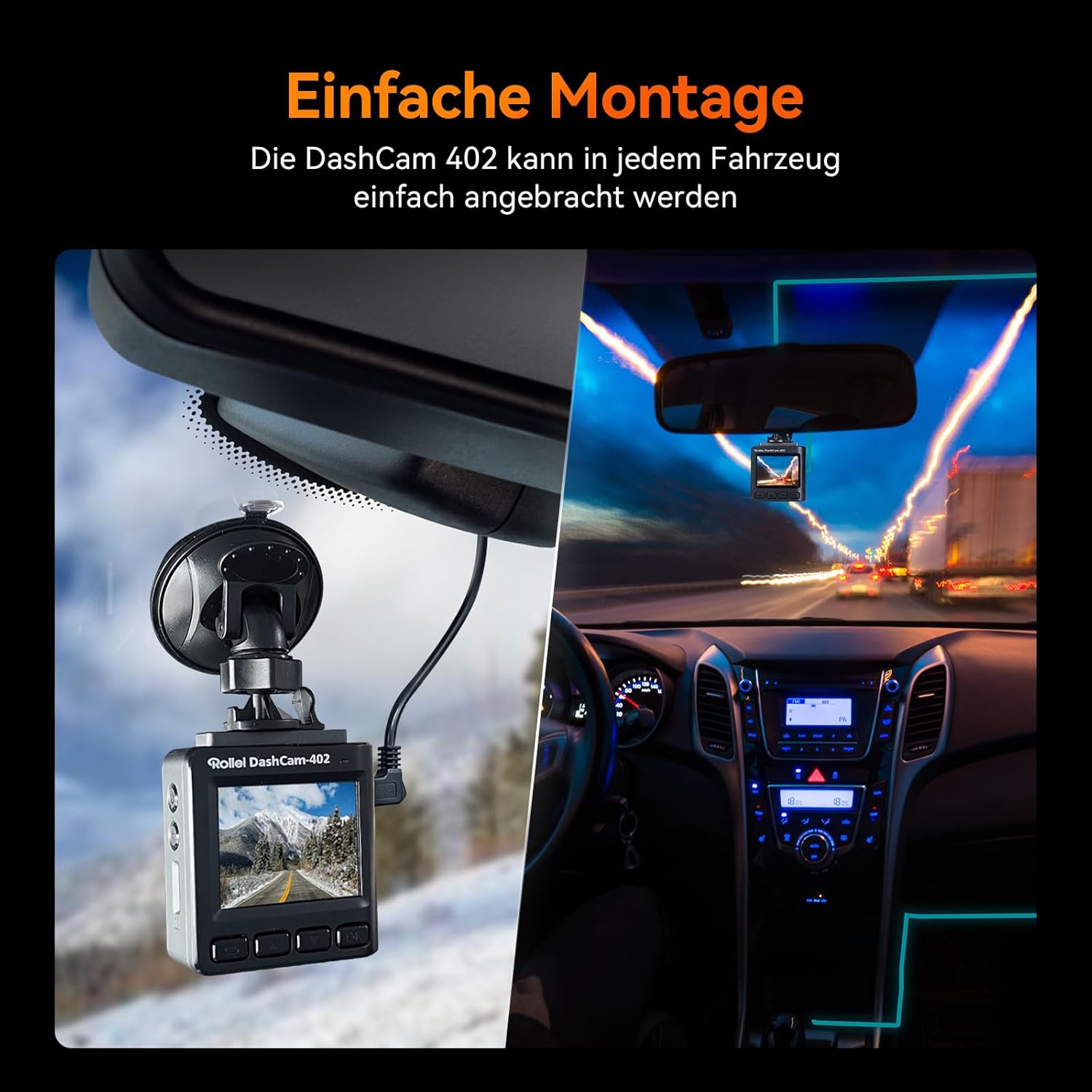 • Лесен монтаж: Видеорегистраторът Rollei може да се монтира отпред или отзад на автомобила ви, на предното стъкло или директно на огледалото за обратно виждане. Компактният му дизайн и здравата вендуза правят монтажа бърз и лесен.