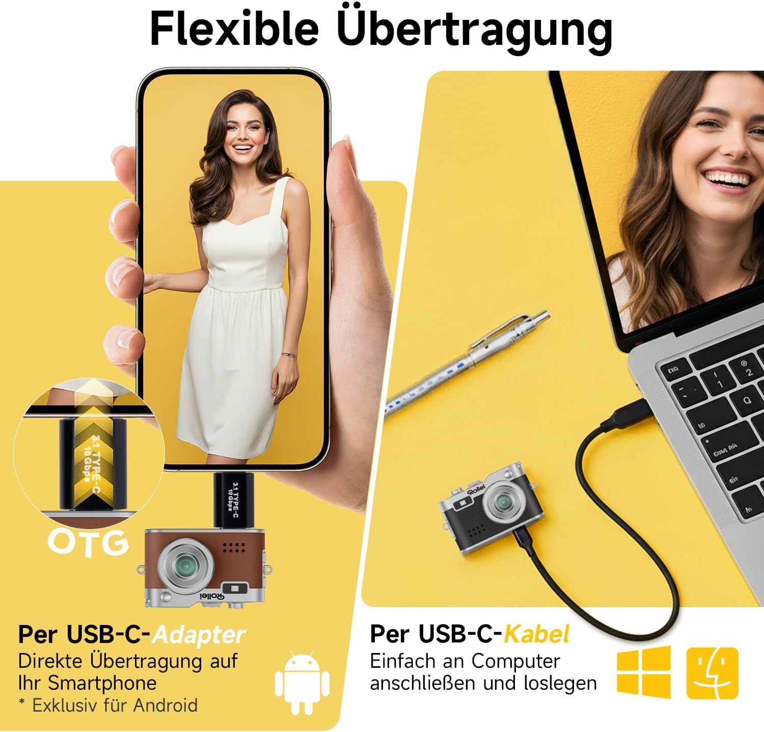 • 2 лесни метода за прехвърляне: с включения OTG адаптер (само за Android), можете лесно да свържете тази малка джобна камера директно към вашия Android смартфон и да прехвърляте снимки и видеоклипове без WiFi. Мини камерата се предлага и с USB-C кабел, който ви позволява не само лесно да зареждате батерията 200 mAh, но и лесно да прехвърляте снимки и видеоклипове към компютър.