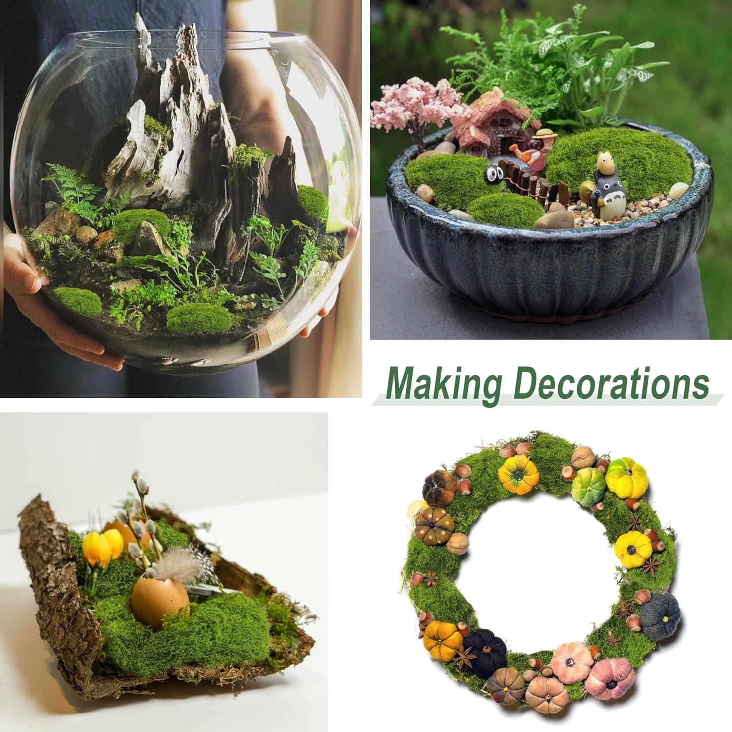 • Креативен дизайн: изкуственият мъх може да се използва за изработка на аквариуми, картини от мъх, стени от мъх, терариумни мъх, гирлянди от мъх, висящи кошници, покривки от мъх, постелки от мъх, изработка на модели от мъх и др.