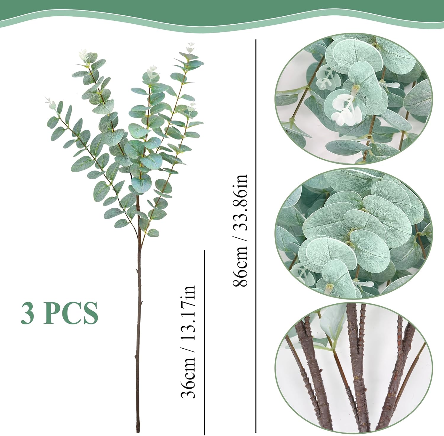 ROLLWAY Пакет от 3 евкалиптови декорации с дължина 86 см, изкуствени евкалиптови клонки, изкуствени като истинско изкуство, големи евкалиптови листа, декоративни клонки, зелени листа за подова ваза, декорация на маса, сватба, градина
