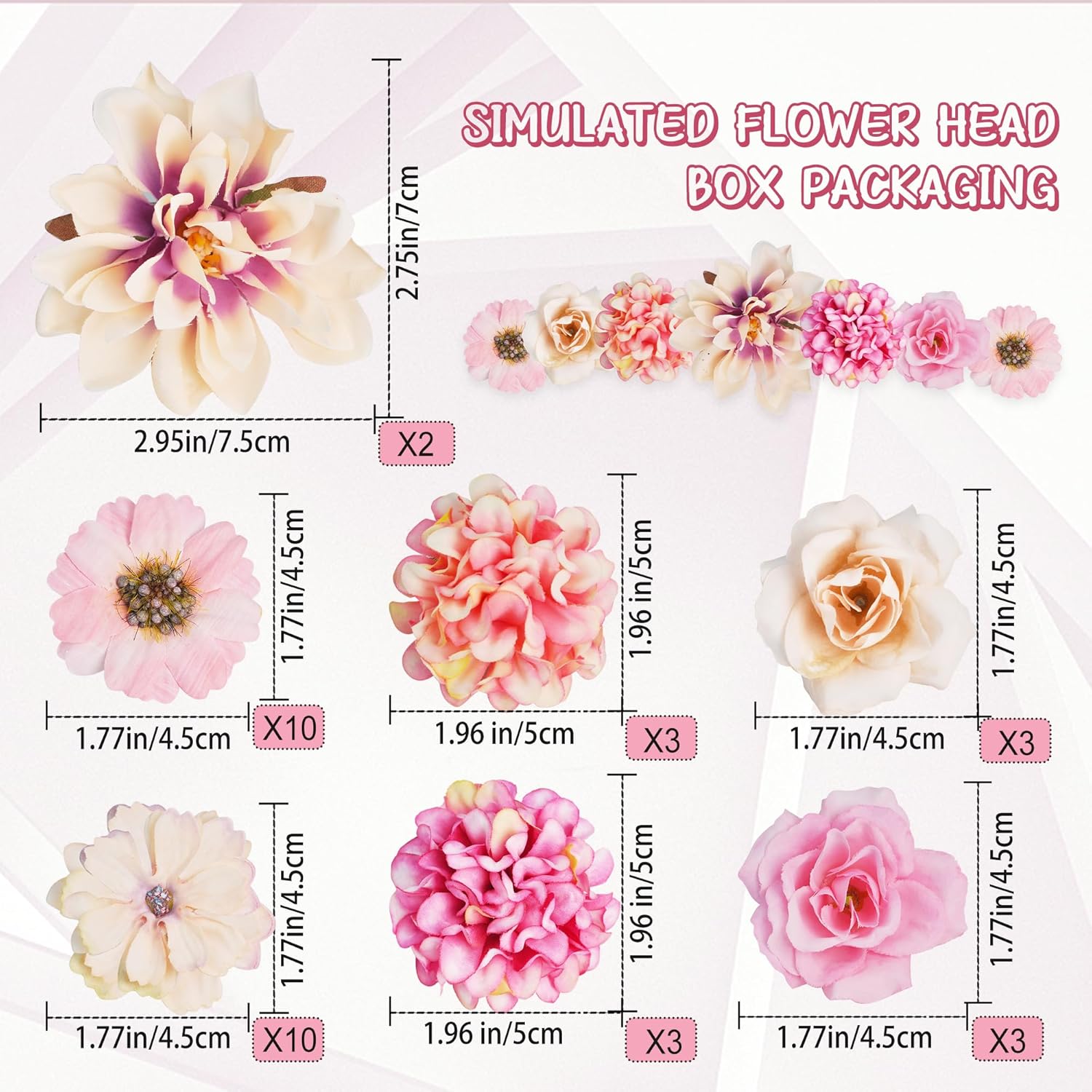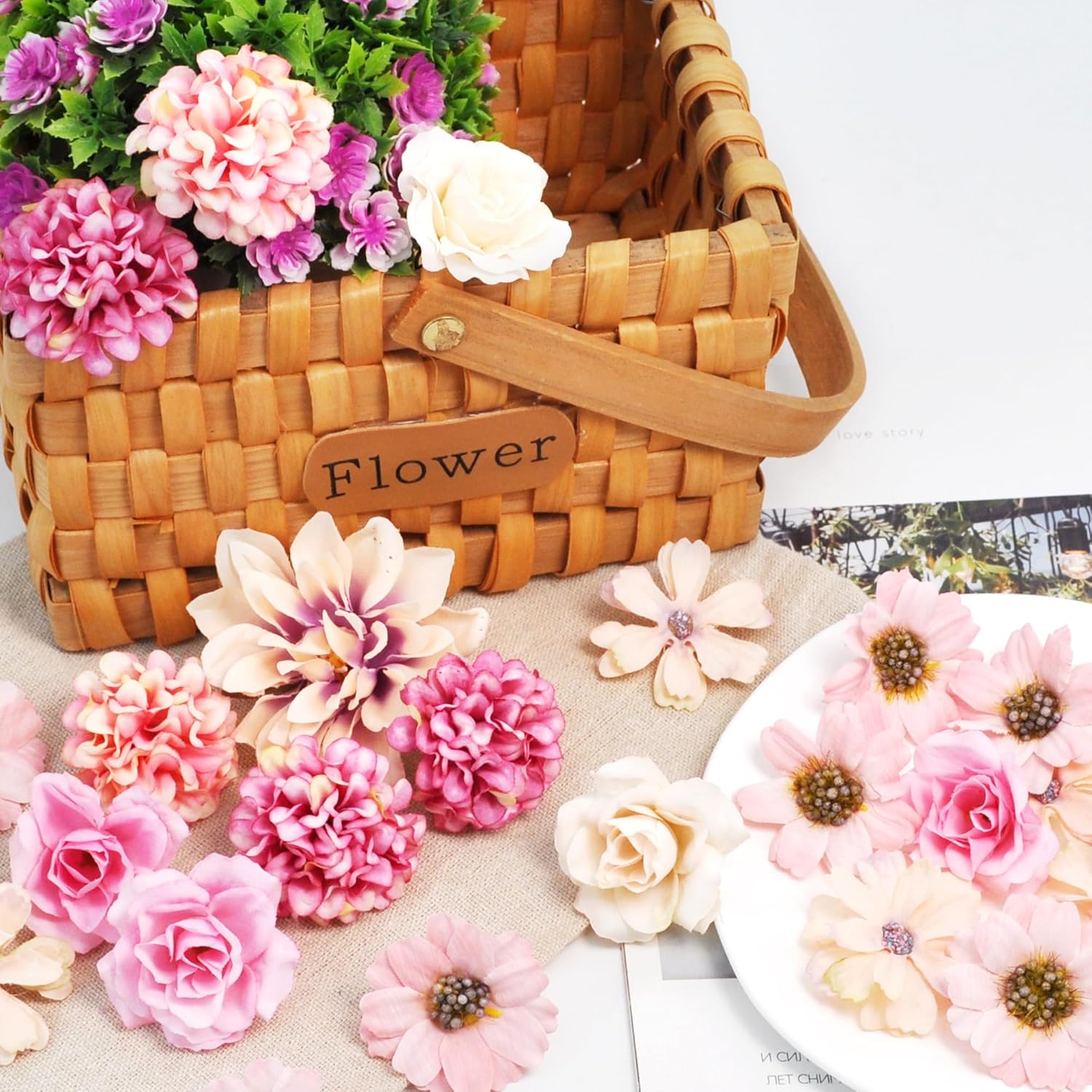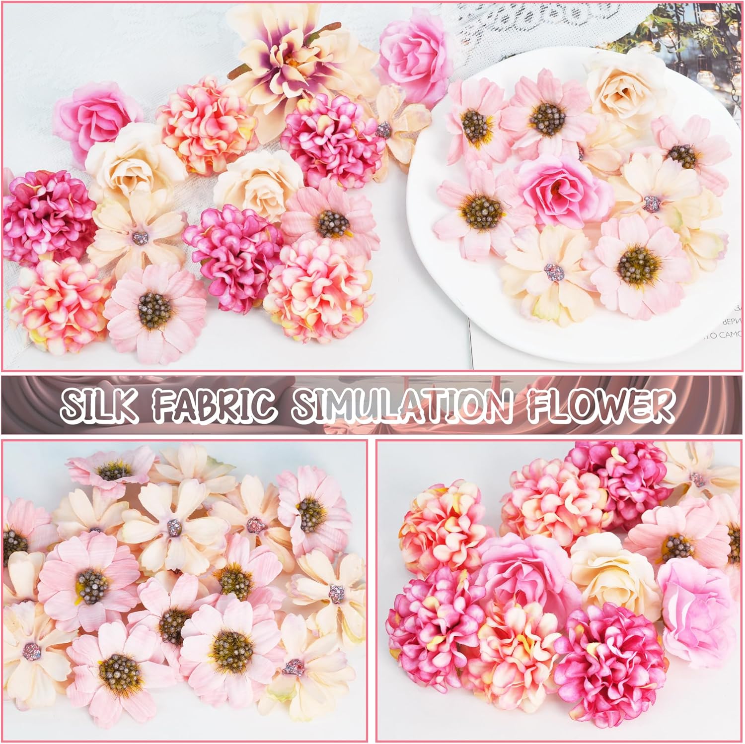 • Универсални: Нашите изкуствени цветя се предлагат в бяло, розово и тъмно розово, включително хортензия, маргаритки, козметика, рози, божури, жасмин и други. 10 вида цветя като цветна декорация за всеки повод.