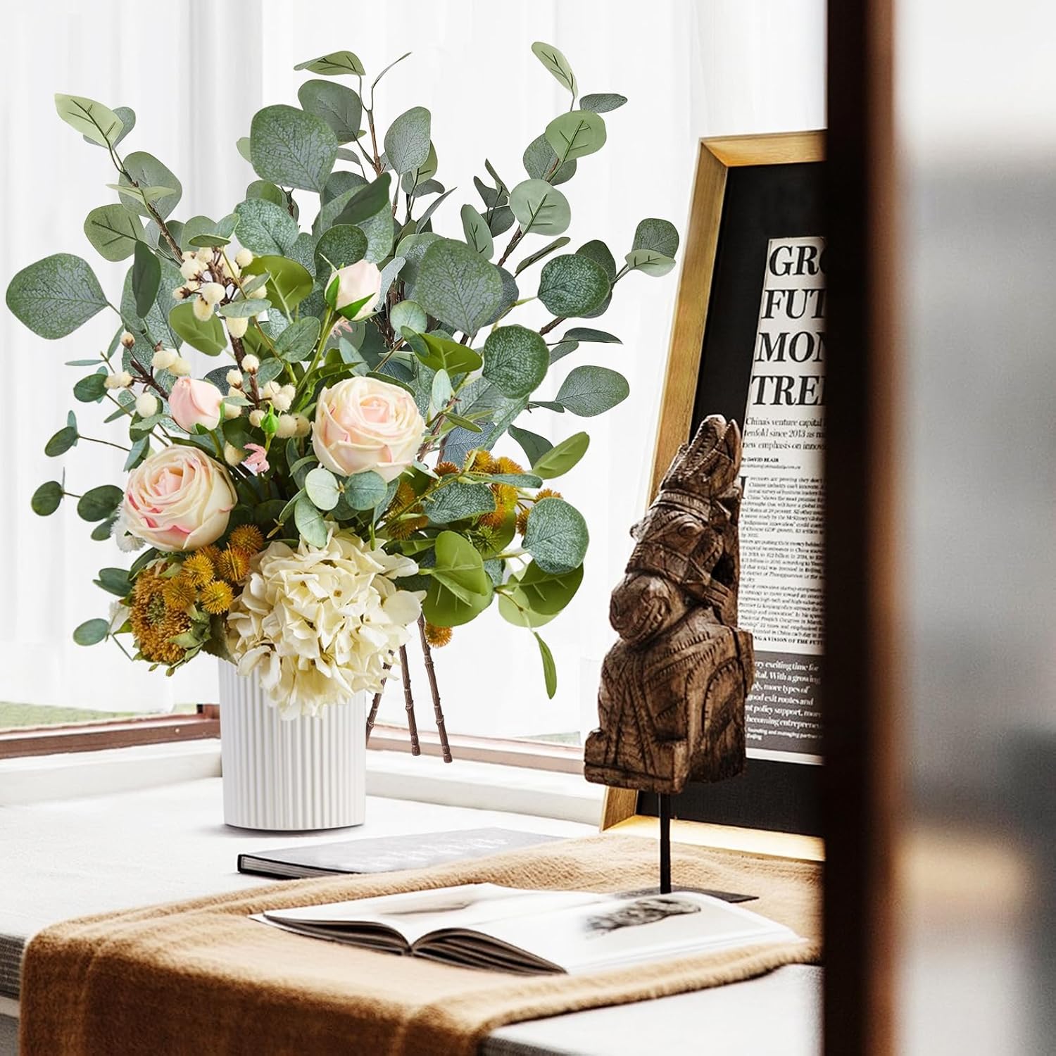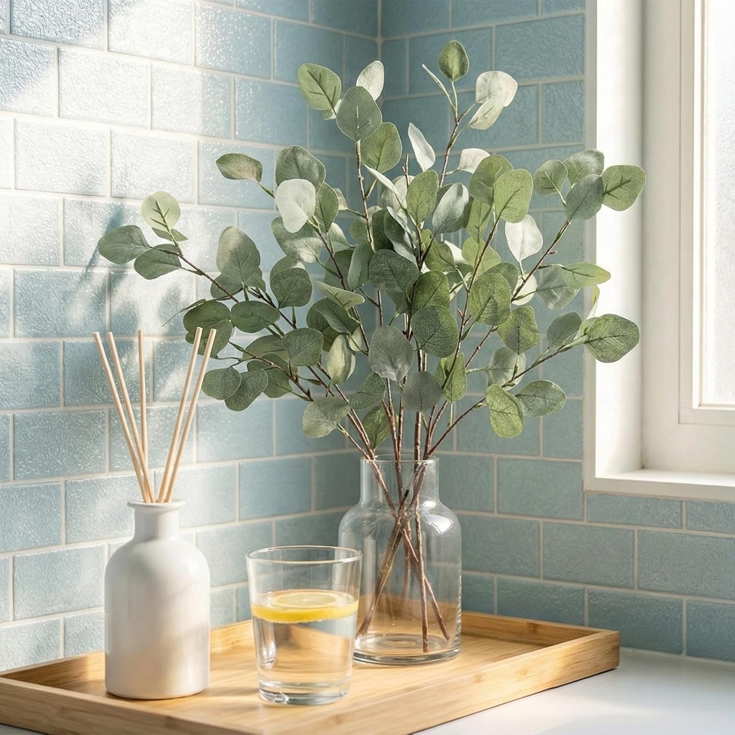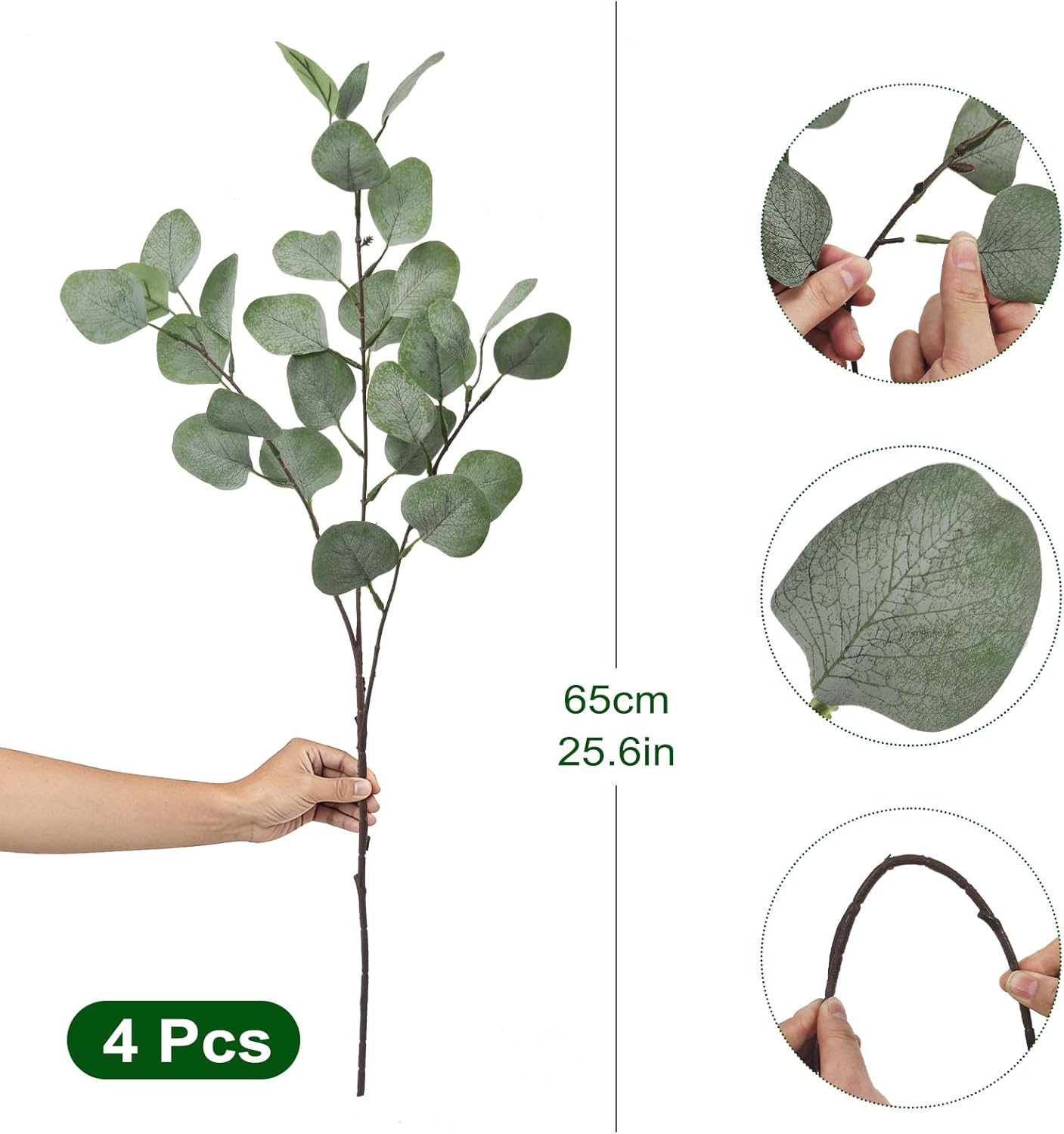 • Висококачествен материал: декоративните листа от евкалипт са изработени от текстил, а стъблата са изработени от метална тел, обвита с пластмаса.