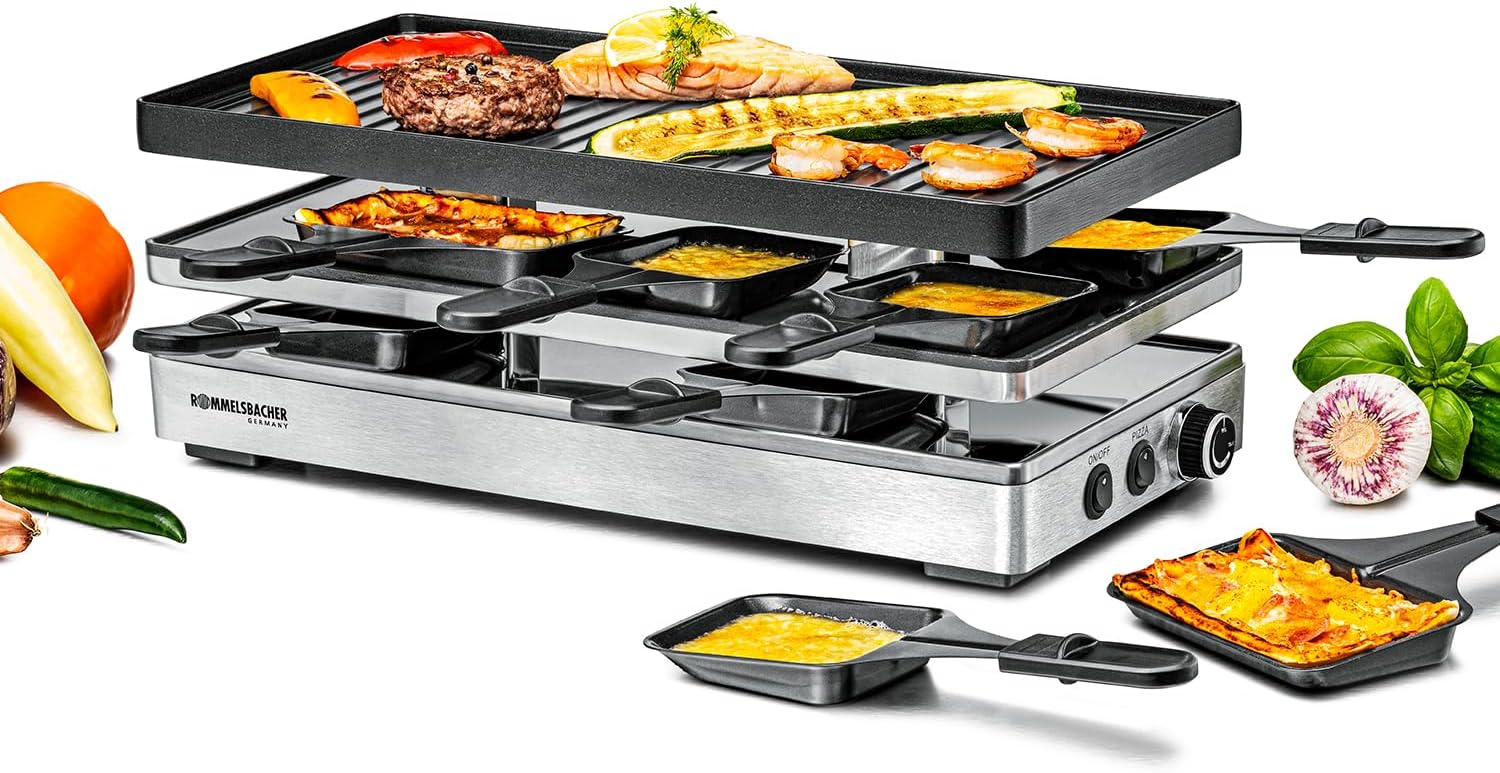 Housing made of high-quality die-cast aluminium with reversible plate and pizza function for a variety of uses: - as a raclette grill with 8 pans, as a pizza station (with bottom heat) for 6 pans, - as a crepe plate for sweets and - as a mobile table grill for year-round use of the raclette and pizza level: - as a raclette level with continuous temperature control, control 1188888Lamp - as pizza level with additional heating for crispy dough base, on/off switch with indicator light, with ceramic non-stick coating (PFAS-free), solid die-cast aluminium reversible plate (41.5 x 20.5 cm) for even and fast temperature transfer, high-quality ceramic non-stick coating (PFAS-free), ribbed grill surface for typical grill pattern, smooth grill surface for vegetables, sweet and multi-central on/off The main switch with the main switch For safe switching off, practical parking deck for hot, unused pans. Extra long cable (2 m), 4 non-slip feet for secure standing. Includes: 8 non-stick pans, 6 non-stick XXL pans, all pans with heat-insulated handles, 8 reversible scrapers, 1 dough cutter