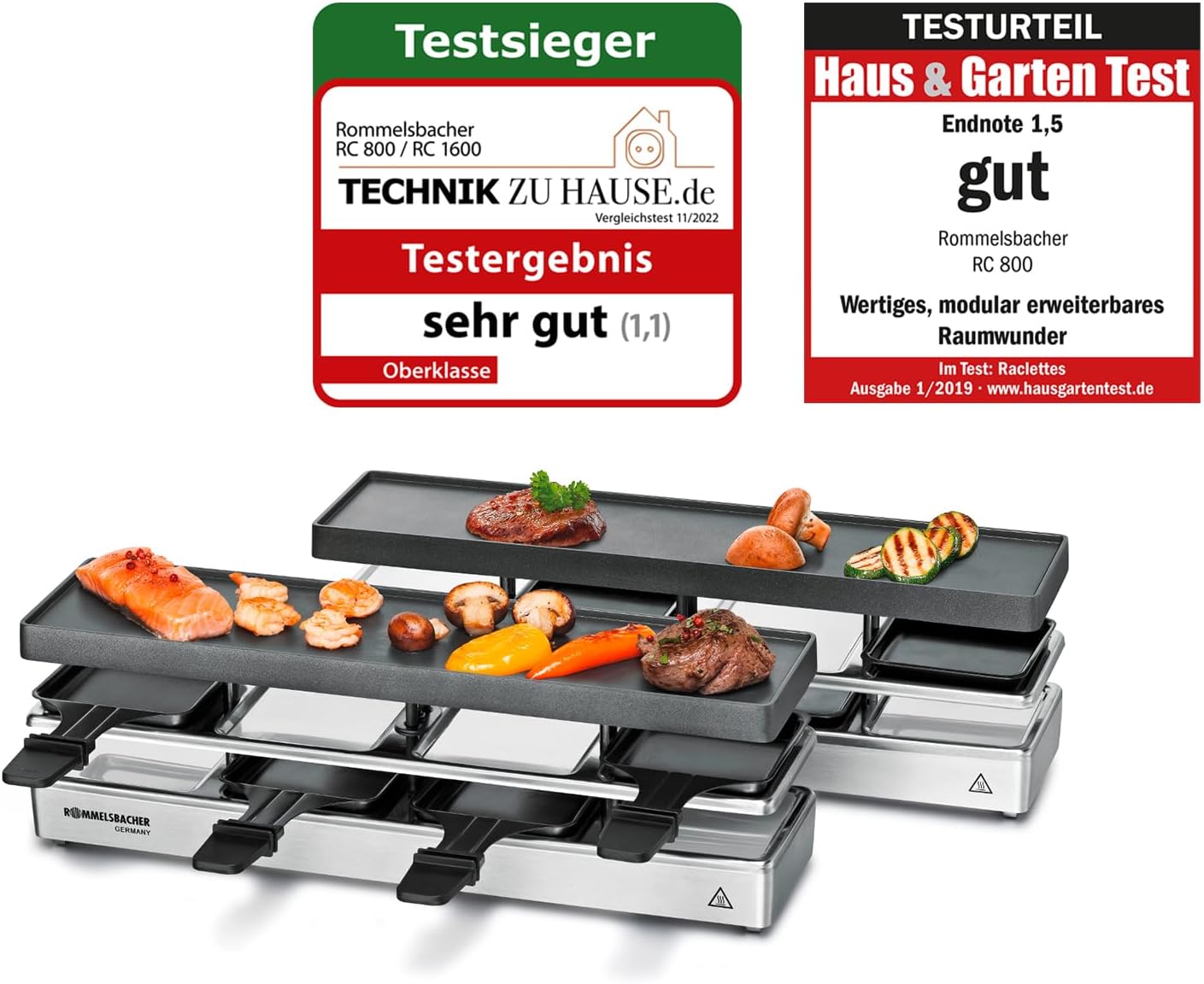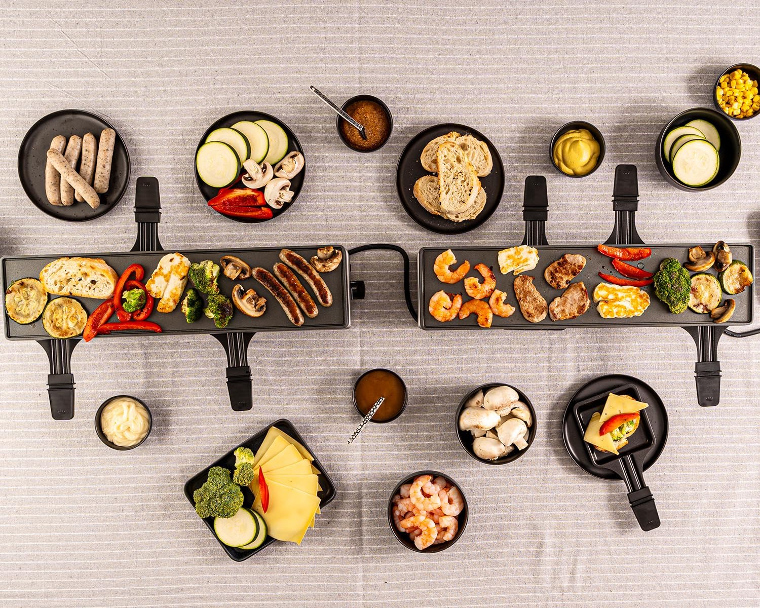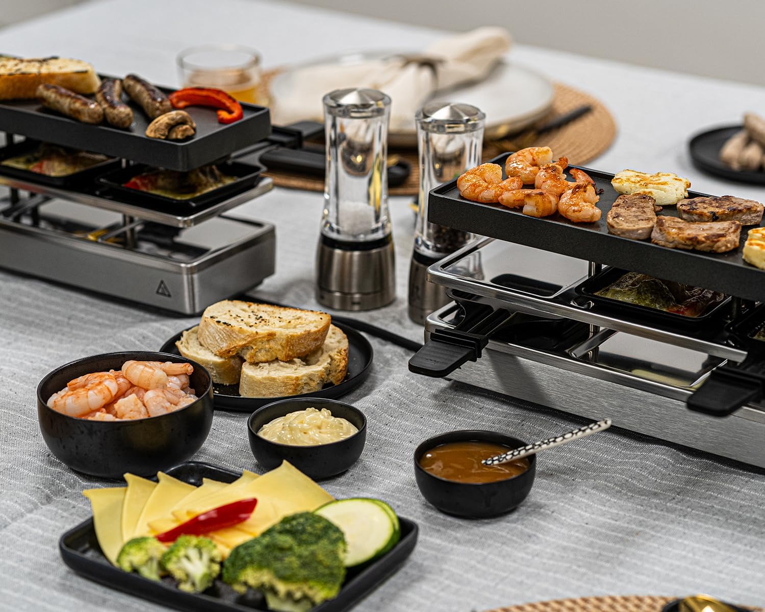 Елегантна серия Raclette & Grill за комбиниране на масата, която не оставя нищо за желано. Висококачествените материали и най-добрата изработка правят тези устройства истински парти звезди. Здравият корпус, изработен от лят алуминий, осигурява стабилна стойка, а масивната плоча за грил осигурява най-добро разпределение на топлината, като температурата може да се регулира според нуждите. Месото и колбасите са перфектни на плочата за грил, но също така риба и зеленчуци; едновременно с това в 4-те тигана на устройство могат да се пекат различни закуски и да се разтопява сирене за раклет. По време на почивките за хранене използваните тигани се съхраняват безопасно и пестят място в интегрираната платформа за паркиране. Висококачественото незалепващо покритие на плочата за грил и тиганите прави боравенето с тях при печене на грил особено приятно и осигурява лесно почистване. Като специален акцент, до три отделни устройства от тази серия могат да бъдат свързани помежду си чрез свързващи кабели и комбинирани помежду си. Това позволява максимално забавление от раклет и барбекю дори за голяма кръгла маса с до 12 тигана.