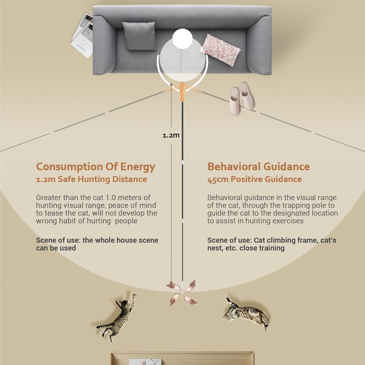 1. Проверявайте редовно играчката: уверете се, че играчките са непокътнати, особено играчката с форма на птица. Ако са повредени, спрете да ги използвате незабавно. Игра под наблюдение: Винаги наблюдавайте котката си, докато играе, и избягвайте да я оставяте без надзор с дълги връвчици или повредени играчки.