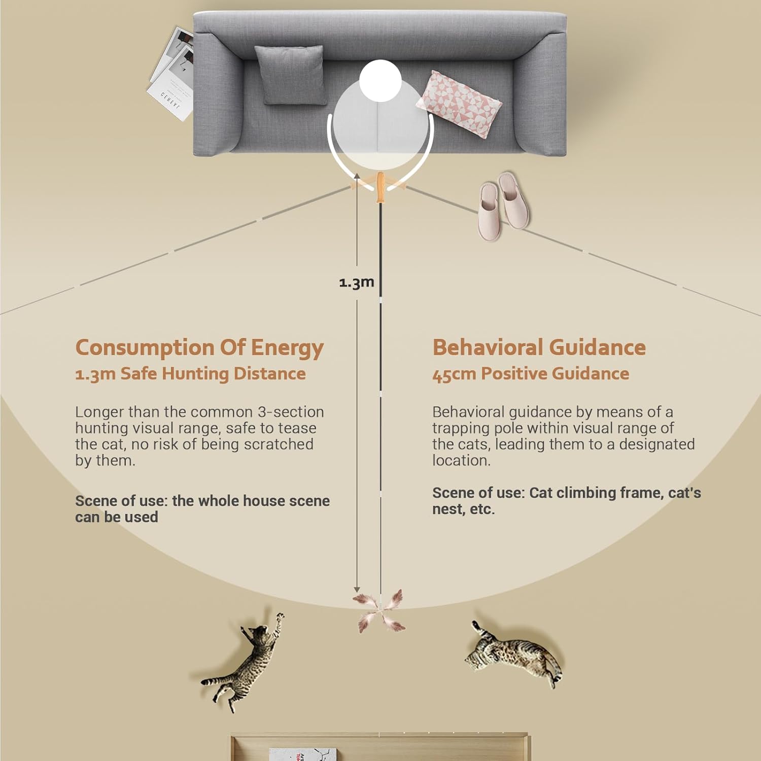 • Играчка за риболов на котка с иновативен дизайн от 3 части: въдицата се разтяга до впечатляващите 107 см и дава на котката достатъчно пространство да тича и скача с радост. След игра играчките удобно се прибират до 16 инча за лесно съхранение.