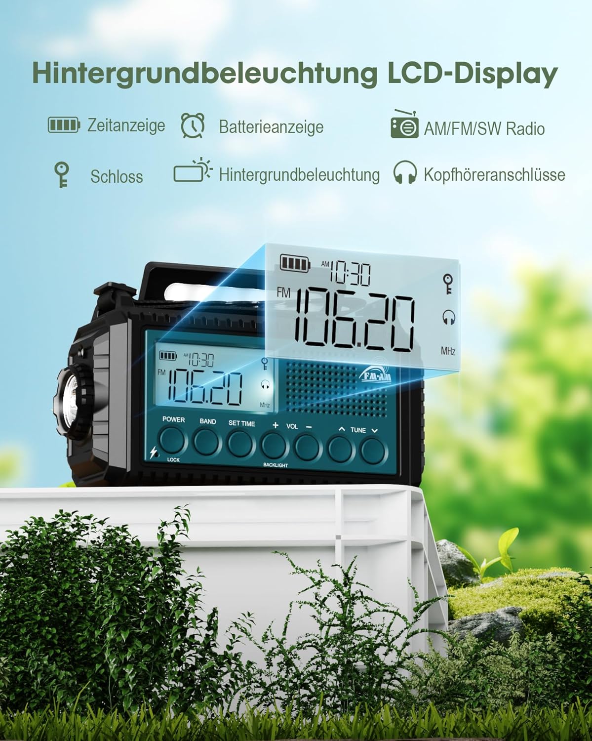 • 【Лесен за инсталиране】 Това аварийно радио има вградена батерия от 12000 mAh и предлага множество опции за зареждане: соларен панел, ръчна манивела и включения USB кабел. Освен това е оборудвано с отделение за батерии за аварийни ситуации (3 AAA батерии, не са включени). LCD екранът показва текущото ниво на зареждане в реално време, така че винаги сте информирани. Когато е напълно заредено, радиото може да възпроизвежда FM радио непрекъснато до 30 часа. Кажете сбогом на внезапните прекъсвания на захранването и винаги бъдете свързани, когато имате най-голяма нужда от него.