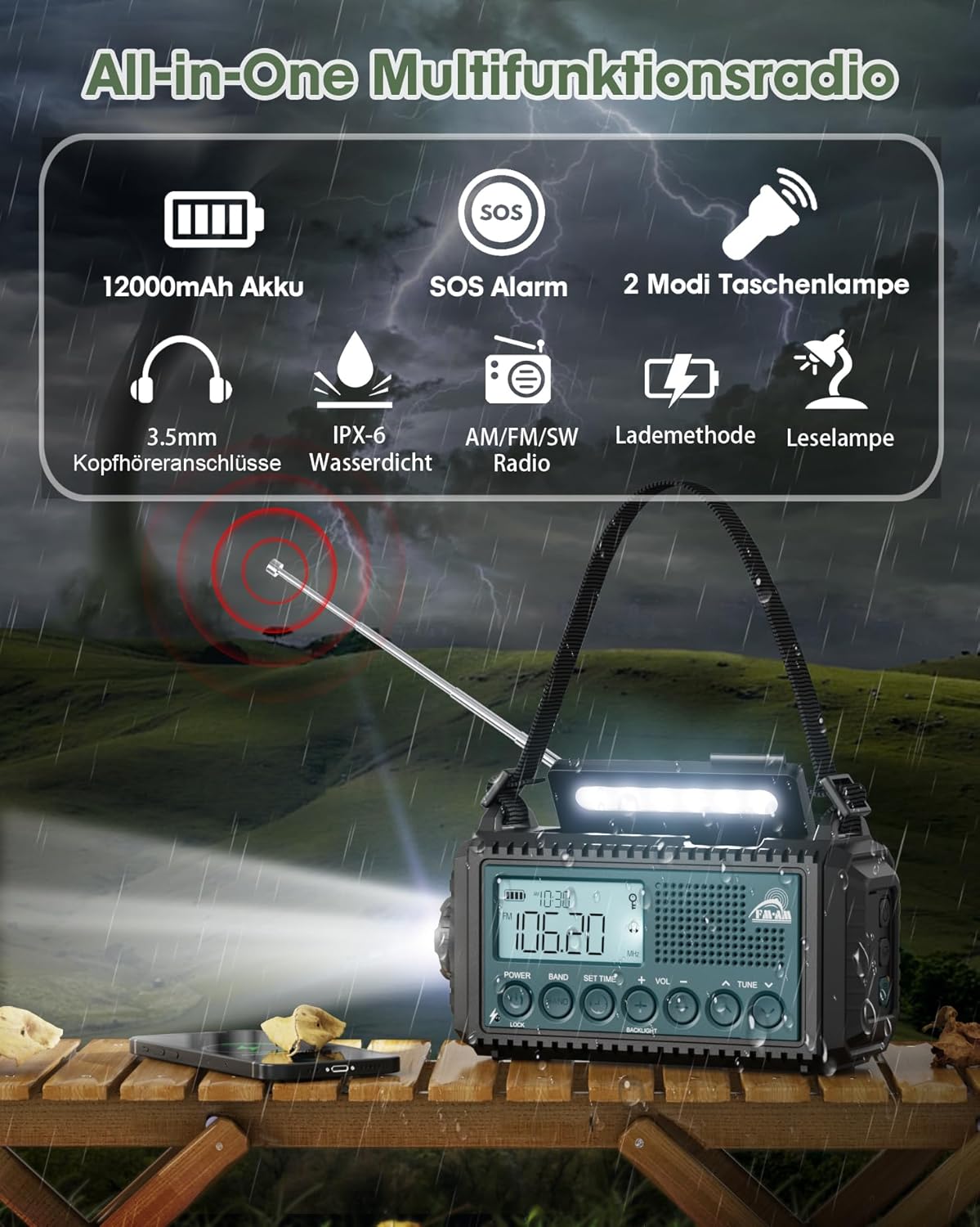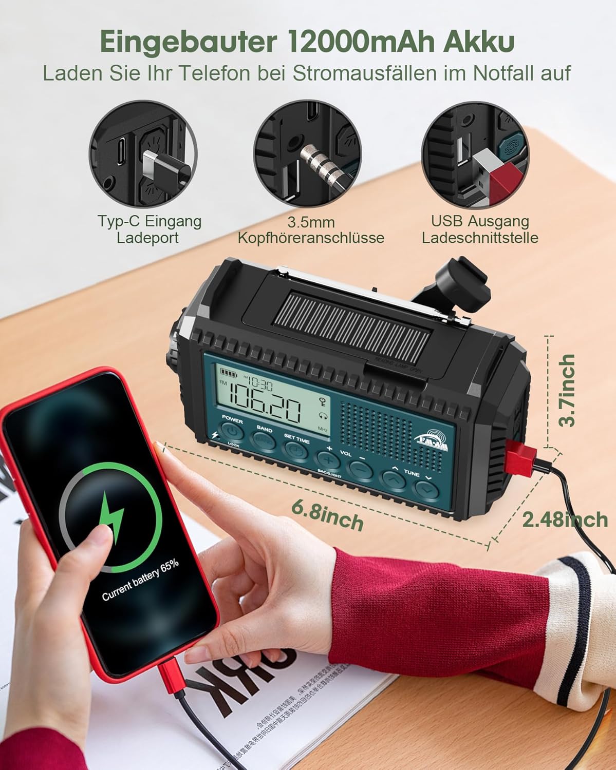 • Независимо дали сте на къмпинг, на туризъм или се сблъсквате с неочаквани кризи, нашето компактно аварийно радио с капацитет 12 000 mAh гарантира несравнима готовност за употреба. С 2,4 пъти по-голям капацитет на батерията от конвенционалните аварийни радиостанции и разнообразни опции за зареждане, то гарантира надеждност в критични моменти.