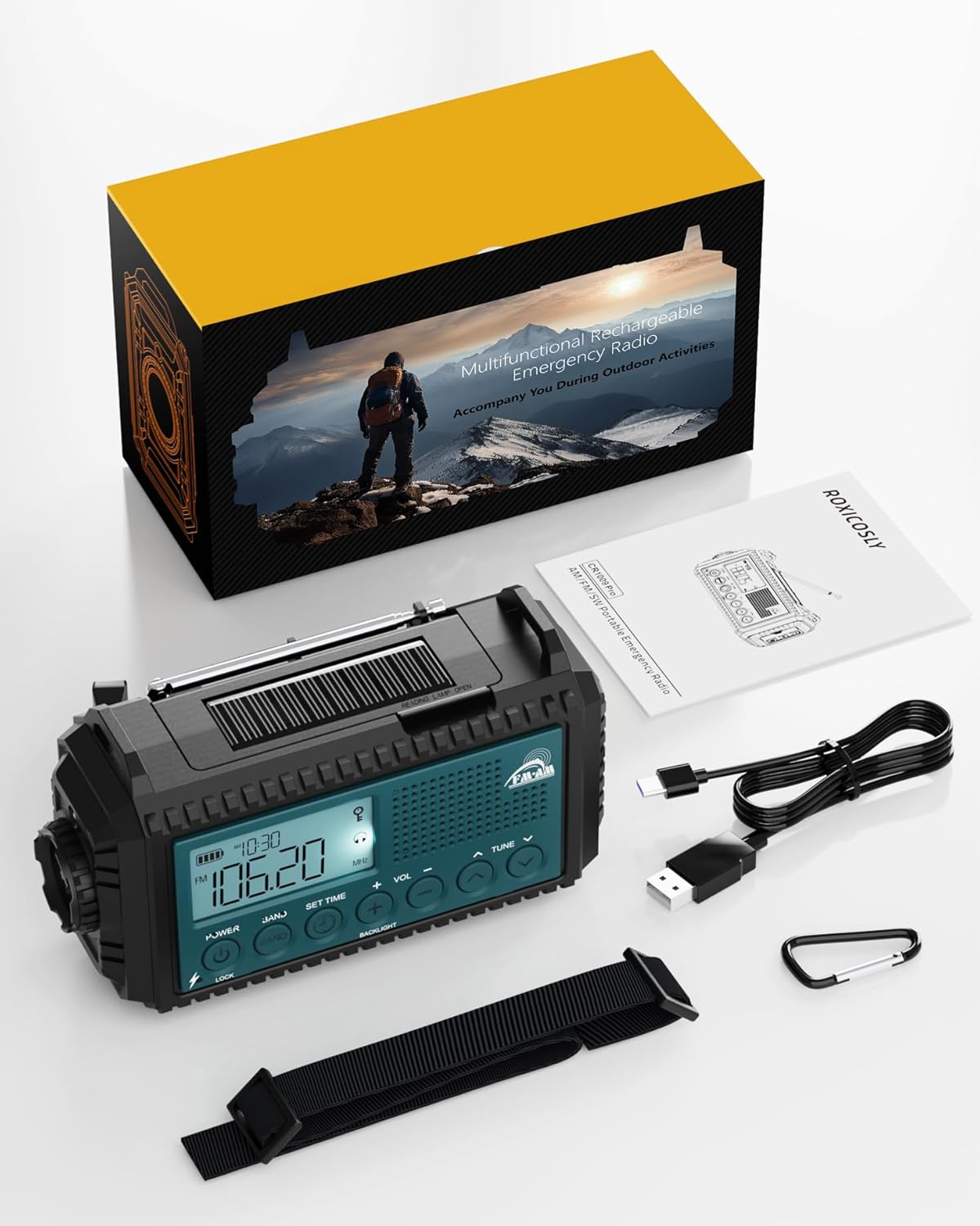 Roxicosly радиостанция с манивела, аварийно радио с 12000 mAh външна батерия, AM/FM строително радио, манивела и 5-посочно слънчево радио със световен приемник, като фенерче и зарядно, за употреба на открито, къмпинг, спешни случаи