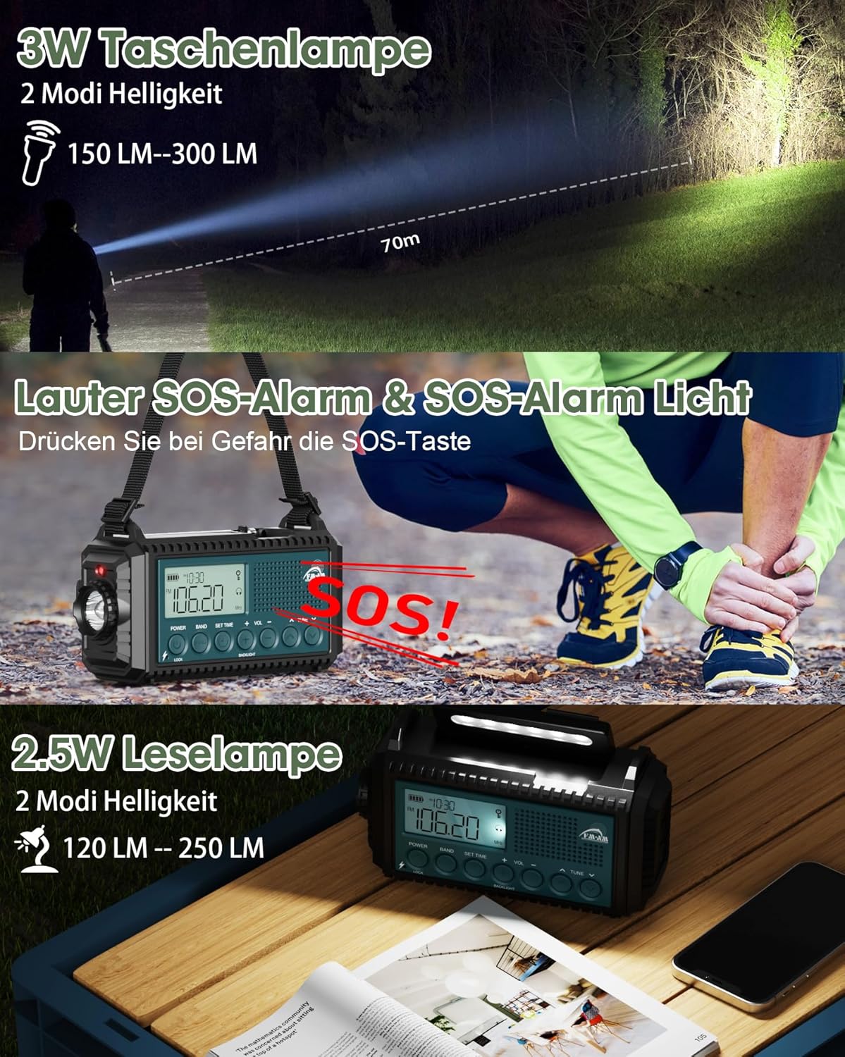 • Дистанционно управление „всичко в едно“ с LED светлина и капак: това устройство е не само радио, работещо с батерии, но и радио с манивела „всичко в едно“ с два източника на светлина с регулируема яркост. Яркият фенер от лявата страна с мощност 2,5 W/3 W (20 часа работа при пълно зареждане) може да освети разстояние до 70 метра, идеално за търсене, когато се изгубите в тъмното. Лампата за четене с мощност 2 W/2,5 W (40 часа работа при пълно зареждане) може да освети стая от 20 м², идеална за осветление на къмпинга.