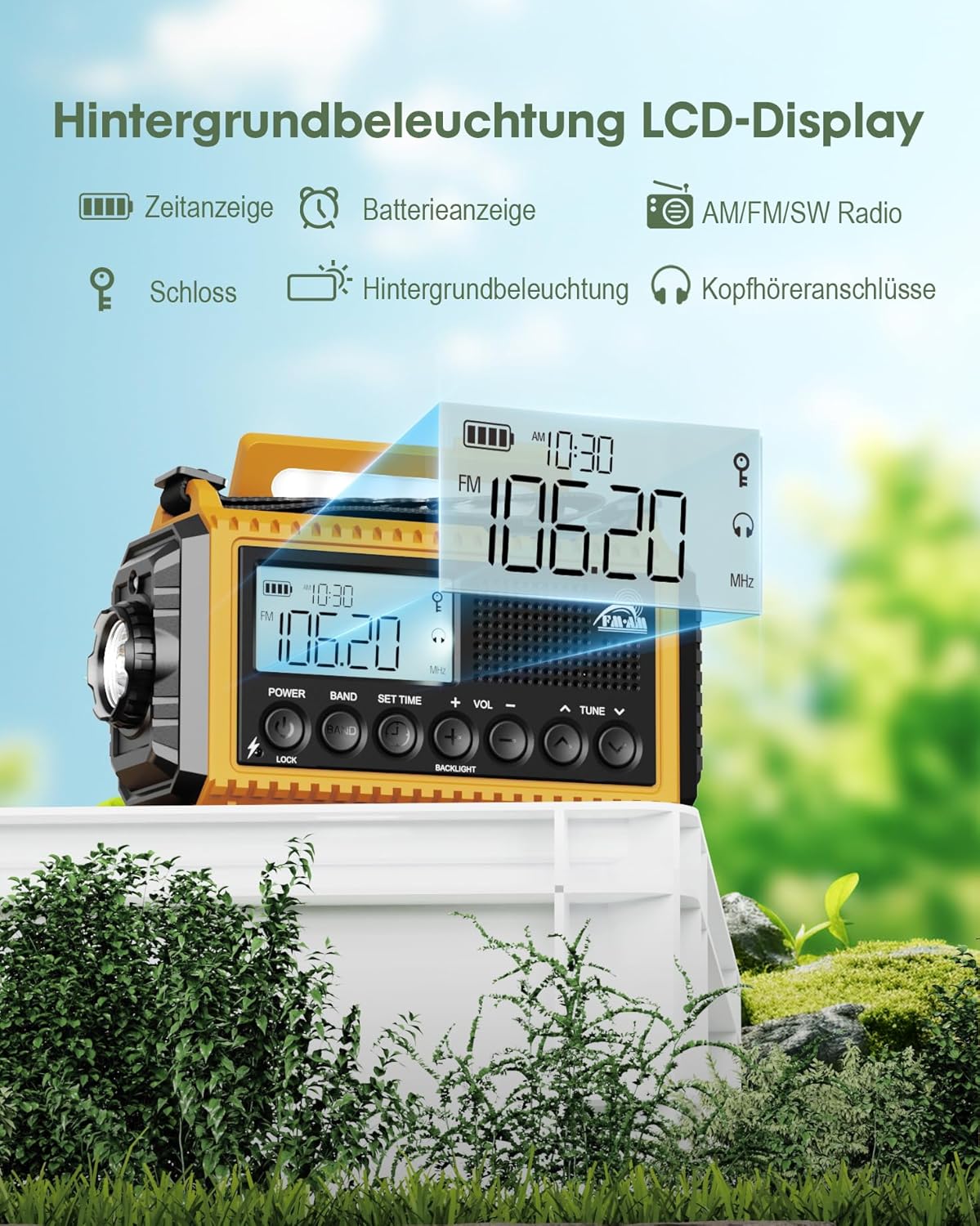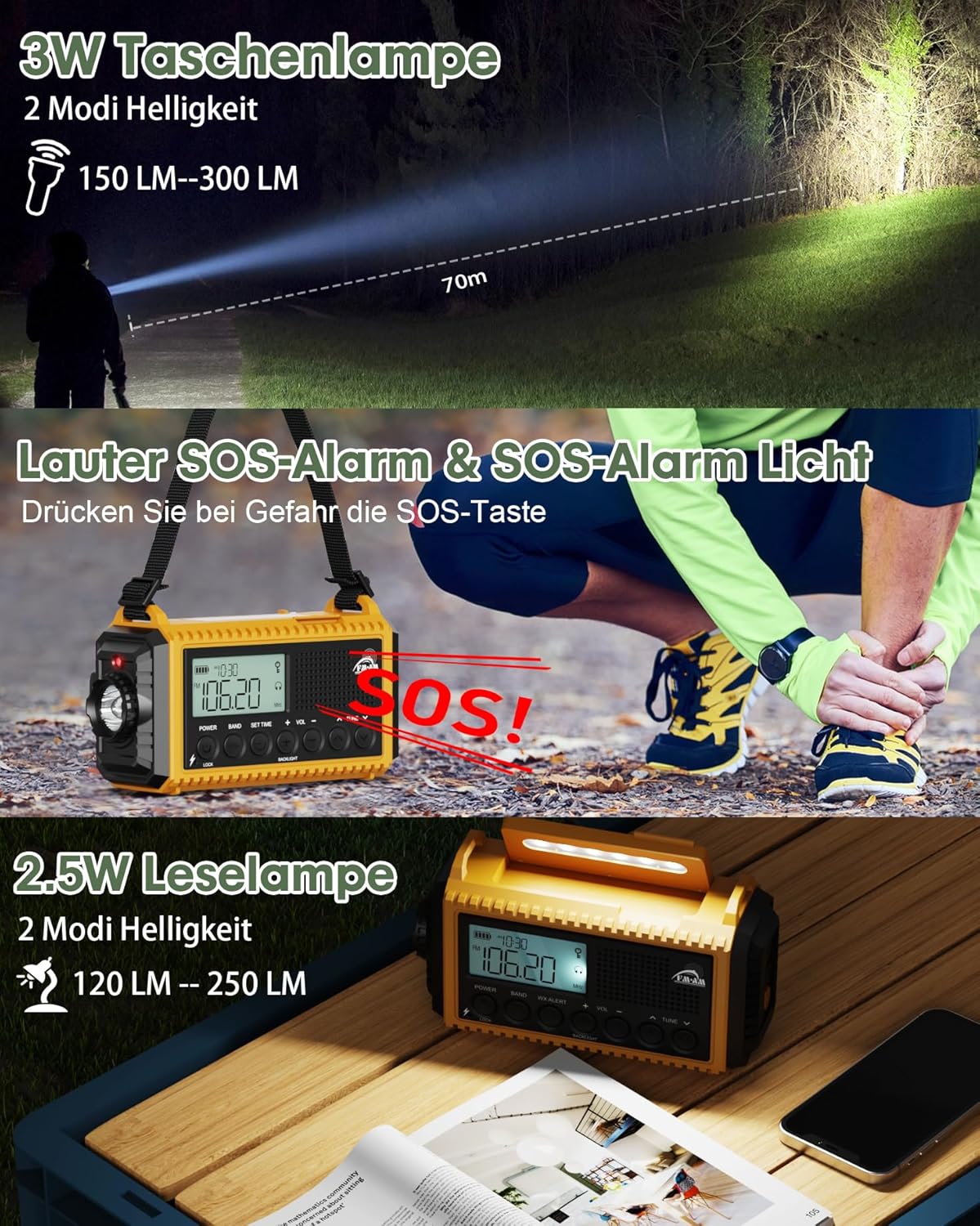 • Дистанционно управление „всичко в едно“ с LED светлина и капак: това устройство е не само радио, работещо с батерии, но и радио с манивела „всичко в едно“ с два източника на светлина с регулируема яркост. Яркият фенер от лявата страна с мощност 2,5 W/3 W (20 часа работа при пълно зареждане) може да освети разстояние до 70 метра, идеално за търсене, когато се изгубите в тъмното. Лампата за четене с мощност 2 W/2,5 W (40 часа работа при пълно зареждане) може да освети стая от 20 м², идеална за осветление на къмпинга.