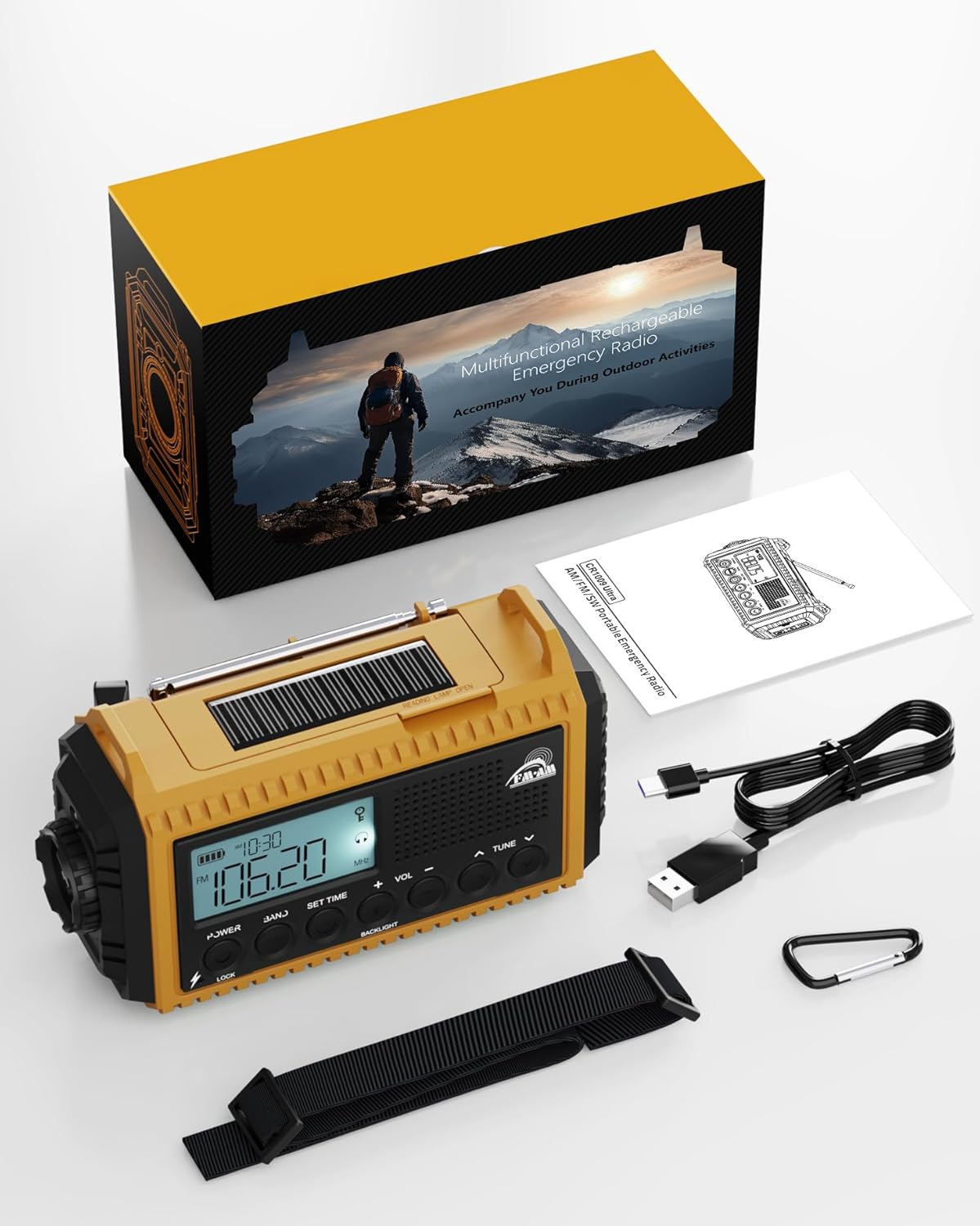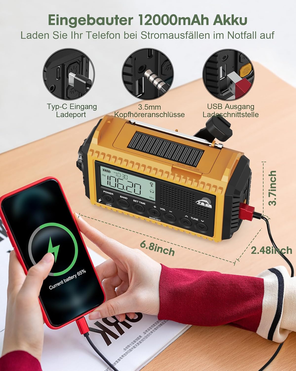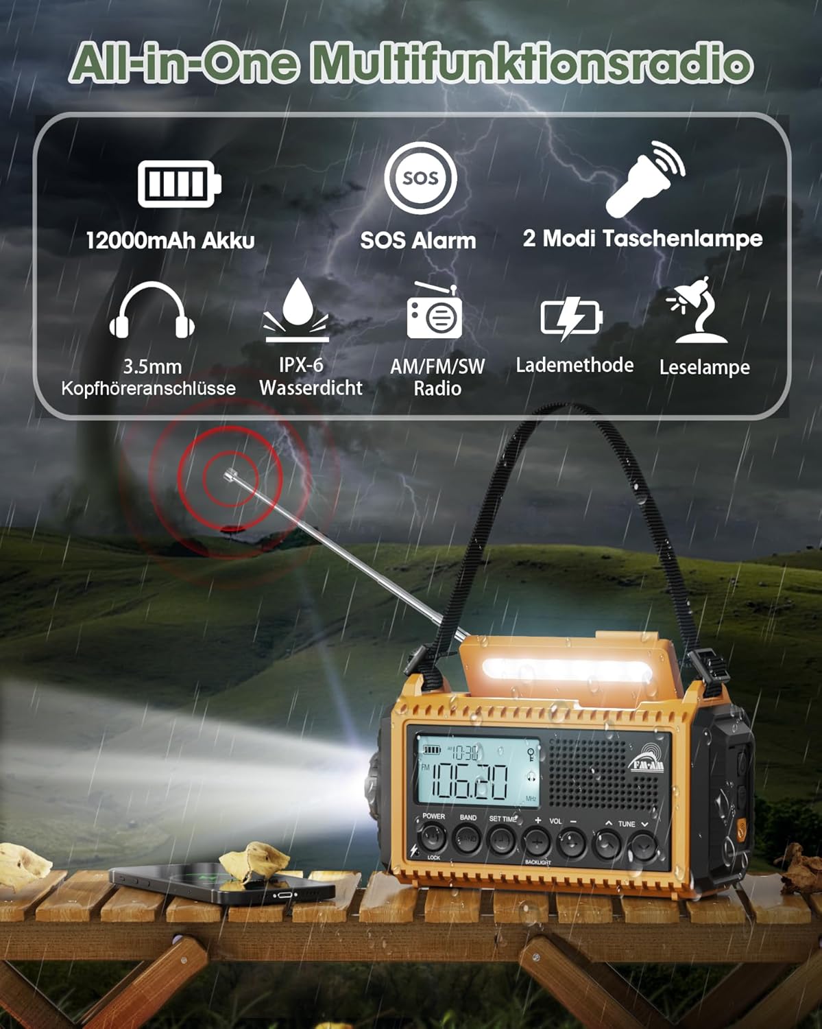 • Независимо дали сте на къмпинг, на туризъм или се сблъсквате с неочаквани кризи, нашето компактно аварийно радио с капацитет 12 000 mAh гарантира несравнима готовност за употреба. С 2,4 пъти по-голям капацитет на батерията от конвенционалните аварийни радиостанции и разнообразни опции за зареждане, то гарантира надеждност в критични моменти.