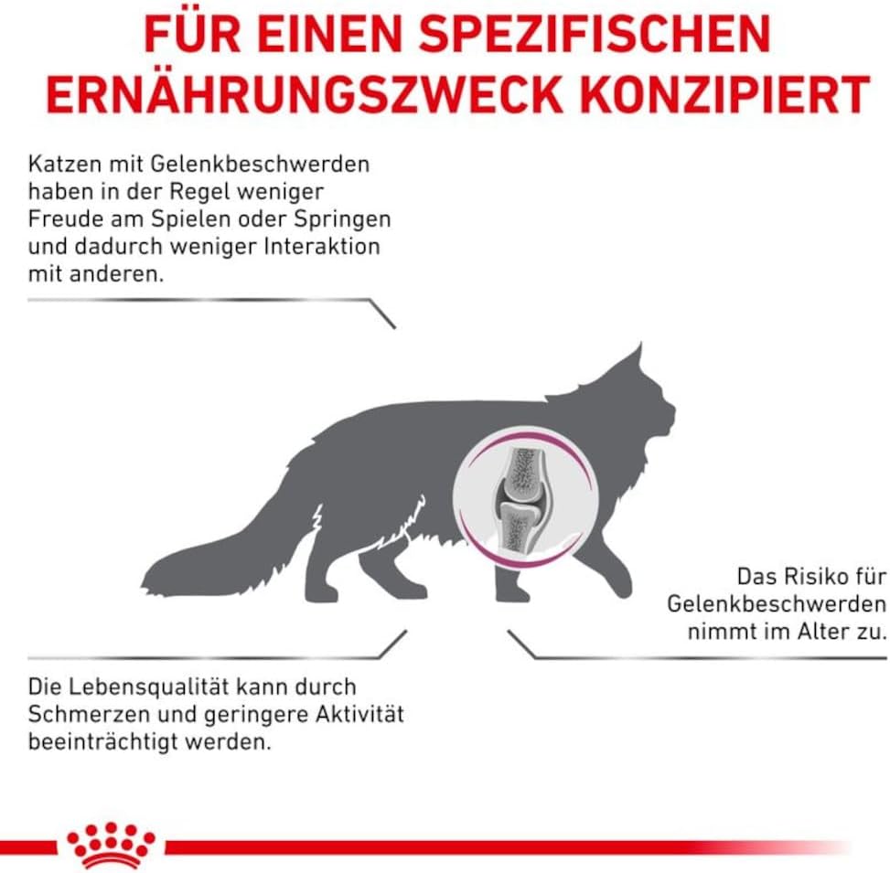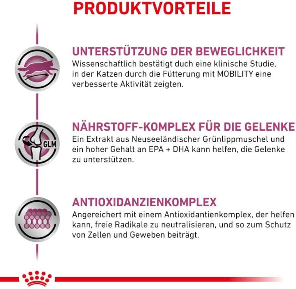 Проблемите със ставите при котките могат да имат много причини, включително генетична предразположеност и износване. Травмите на ставите и прекомерното натоварване поради наднормено тегло също са чести виновници. Royal Canin Mobility е специализирана храна за котки със ставни проблеми и е подходяща и преди и след операция на опорно-двигателния апарат. Формулата включва хранителни вещества от новозеландски зеленоусти миди за облекчаване на симптомите. Дълговерижните мастни киселини EPA и DHA също допринасят за здравето на ставите, като помагат за модулиране на възпалителните реакции в ставите. Специален антиоксидантен комплекс осигурява защита срещу агресивни метаболитни странични продукти.