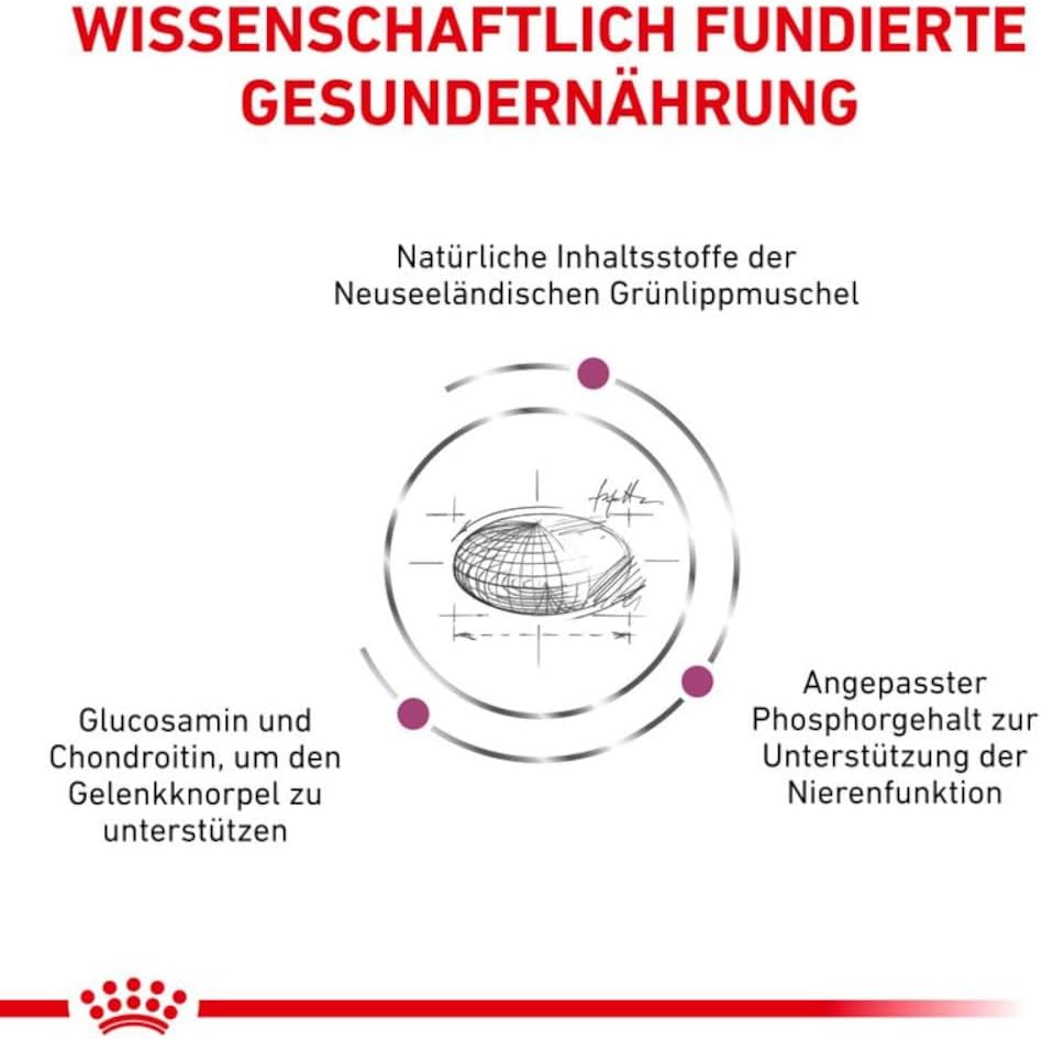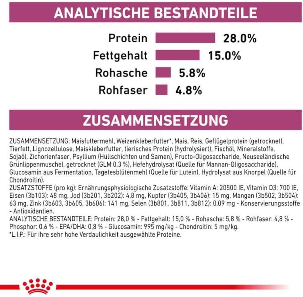 Zusammensetzung: Maisfuttermehl, Weizenkleberfutter*, Mais, Reis, Geflügelprotein getrocknet, Tierfett, Lignozellulose, Maiskleber, tierisches Protein hydrolysiert, Fischöl, Mineralstoffe, Sojaöl, Zichorienfaser, Psyllium (Hüllschichten und Samen), Fructo-Oligosaccharide, Neuseeländische Grünlippmuschel (GLM) getrocknet (0,3%), Hefe hydrolysiert (Quelle für Mannan-Oligosaccharide), Glucosamin aus Fermentation, Tagetesmehl, Knorpel hydrolysiert (Quelle für Chondroitin). Zusatzstoffe (pro kg): Ernährungsphysiologische Zusatzstoffe: Vitamin A: 20500IE, Vitamin D3: 700IE, Eisen (3b103): 48mg, Jod (3b201, 3b202): 4,8mg, Kupfer (3b405, 3b406): 15mg, Mangan (3b502, 3b504): 63mg, Zink (3b603, 3b605, 3b606): 141mg, Selen (3b801, 3b811, 3b812): 0,09mg-Konservierungsstoffe-Antioxidantien. Analytische Bestandteile: Protein: 28,0% - Fettgehalt: 15,0% - Rohasche: 5,8% - Rohfaser: 4,8% - Phosphor: 0,6% - EPA/DHA: 0,8% - Glucosamin: 995mg/kg - Chondroitin: 5mg/kg.