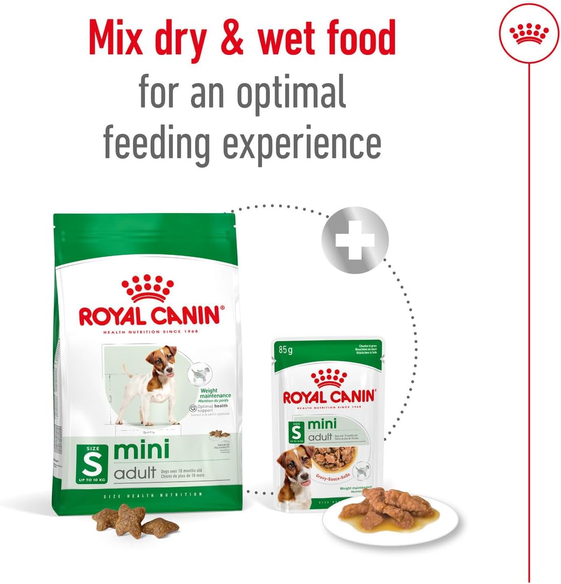 Мократа храна Royal Canin Mini Adult е специално формулиран хранителен разтвор за малки кучета до 10 кг. Тази мокра храна предлага балансирана комбинация от витамини и хранителни вещества, които могат да допринесат за жизнеността и цялостното благополучие. Рецептата е съобразена със специфичните нужди на малки, възрастни кучета над 10-месечна възраст и осигурява адаптирано енергийно съдържание, за да поддържа идеалното тегло на вашето куче. Хранителните вещества, които съдържа, спомагат за здрава кожа и лъскава козина, а високата ѝ вкусова стойност гарантира вкусно хранене. Royal Canin Mini Adult се предлага и като суха храна, което позволява разнообразен режим на смесено хранене. Продуктите са опаковани в защитна атмосфера, за да се гарантира свежест и хранителни качества. Препоръка за хранене: 1–2 пакетчета на ден, в зависимост от теглото и нивото на активност на кучето. Осигурете винаги прясна вода. Възползвайте се от качеството и хранителната подкрепа на тази балансирана мокра храна.