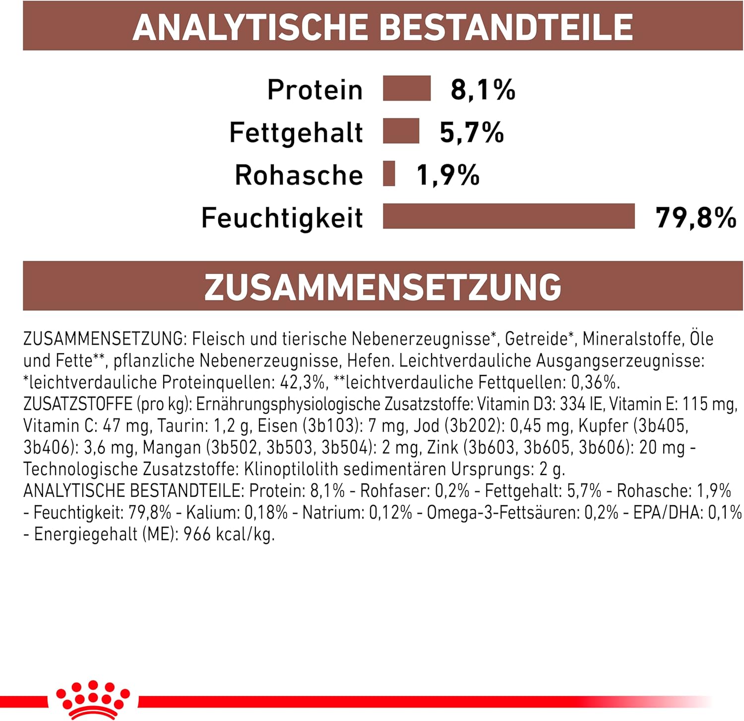 Zusammensetzung: Fleisch und tierische Nebenerzeugnisse, Getreide, Öle und Fette, pflanzliche Nebenerzeugnisse, Mineralstoffe, Hefe, Zucker. Leicht verdauliche Ausgangserzeugnisse: Fleisch und tierische Nebenerzeugnisse (Huhn, Schwein), Maisfuttermehl, Maisstärke-Mischung. Analytische Bestandteile: Protein: 8,0 % - Fettgehalt: 5,6 % - Rohasche: 1,8 % - Rohfaser: 0,24 % - Feuchtigkeit: 80,0 % - Natrium: 0,12 % - Kalium: 0,18 % - Fettsäuren: ω3: 0,21 %, ω6: 1,4 % - Energiegehalt (ME): 955,0 kcal/kg. Zusatzstoffe (Pro KG)**: Ernährungsphysiologische Zusatzstoffe: Vitamin D3: 330 IE, Eisen (3b103): 7 mg, Jod (3b202): 0,4 mg, Kupfer (3b405, 3b406): 3,3 mg, Mangan (3b502, 3b503, 3b504): 2,2 mg, Zink (3b603, 3b605, 3b606): 22 mg - Technologische Zusatzstoffe: Klinoptilolith sedimentären Ursprungs: 2 g. **Die Werte entsprechen den der Rezeptur zugefügten, nicht den natürlicherweise im Produkt vorkommenden Mengen.