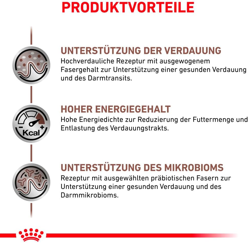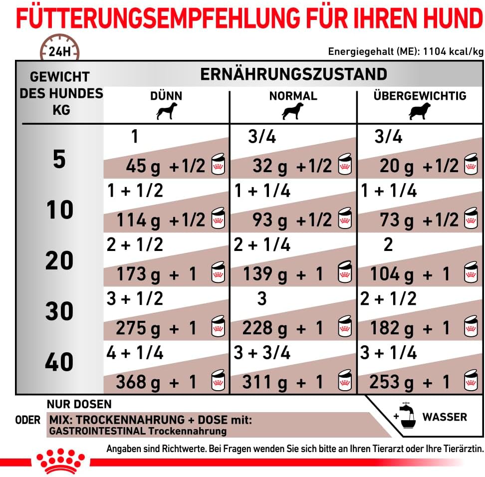 ROYAL CANIN® GASTROINTESTINAL Mousse е пълноценна диетична храна за кучета, която може да помогне за облекчаване на остра чревна малабсорбция и да подпомогне наддаването на тегло по време на възстановяване. Съдържа лесно смилаеми съставки, повишено съдържание на електролити и висока концентрация на основни хранителни вещества. Също така е високоенергийна. Продължителността на хранене зависи от тежестта на стомашно-чревните симптоми. За оптимизиране на храносмилането, препоръчителната дневна дажба трябва да се раздели на няколко малки хранения. Информация за смесено хранене можете да намерите в края на раздела „Диетични храни за стомашно-чревния тракт“. Този продукт може да се дава и на растящи кучета от 6-месечна възраст.