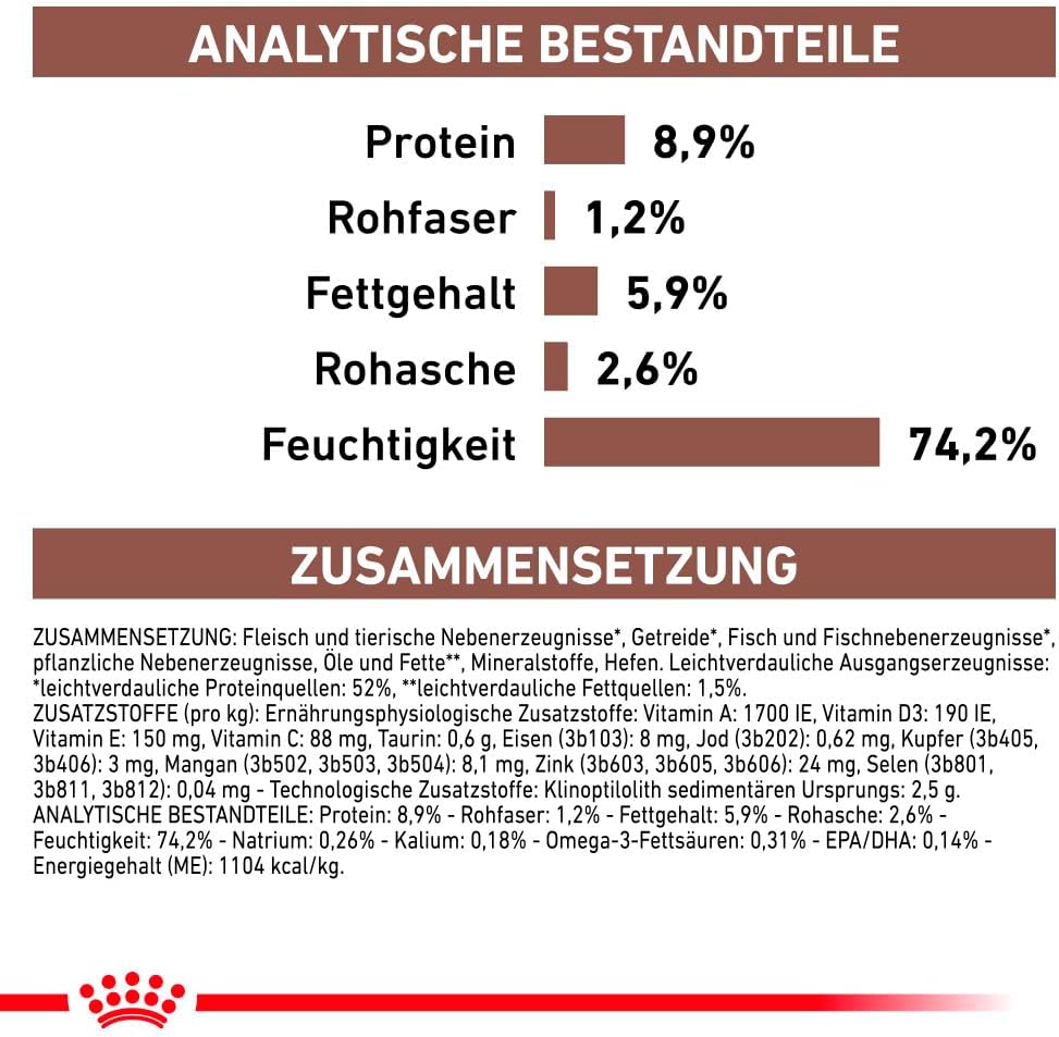 Zusammensetzung: Fleisch und tierische Nebenerzeugnisse, Fisch und Fischnebenerzeugnisse, Getreide, pflanzliche Nebenerzeugnisse, Öle und Fette, Mineralstoffe, Hefe. Leicht verdauliche Ausgangserzeugnisse: Fleisch und tierische Nebenerzeugnisse (Schwein, Geflügel), Lachs, Reis. Analytische Bestandteile: Protein: 8,9 % - Fettgehalt: 5,9 % - Rohasche: 2,4 % - Rohfaser: 1,2 % - Feuchtigkeit: 74,0 % - Natrium: 0,27 % - Kalium: 0,17 % - Fettsäuren: ω3: 0,38 %, ω6: 1,8 % - Energiegehalt (ME): 1111,0 kcal / kg. Zusatzstoffe (Pro kg)**: Ernährungsphysiologische Zusatzstoffe: Vitamin D3: 260 IE, Eisen (3b103): 6 mg, Jod (3b202): 0,3 mg, Kupfer (3b405, 3b406): 2,8 mg, Mangan (3b502, 3b503, 3b504): 2 mg, Zink (3b603, 3b605, 3b606): 20 mg - Technologische Zusatzstoffe: Klinoptilolith sedimentären Ursprungs: 2,5 g. **Die Werte entsprechen den der Rezeptur zugefügten, nicht den natürlicherweise im Produkt vorkommenden Mengen.