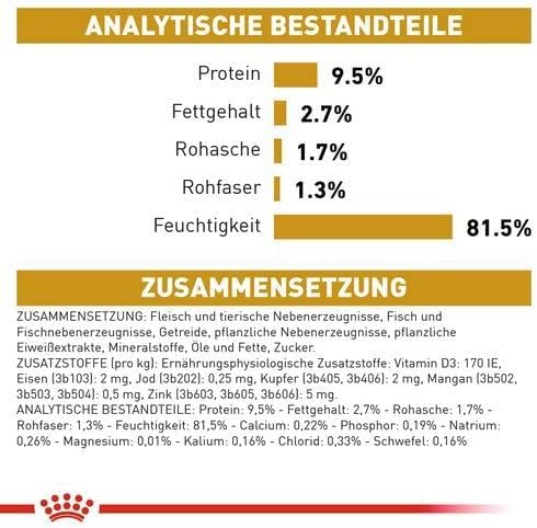 ZUSAMMENSETZUNG: Fleisch und tierische Nebenerzeugnisse, Fisch und Fischnebenerzeugnisse, Getreide, pflanzliche Nebenerzeugnisse, pflanzliche Eiweißextrakte, Mineralstoffe, Öle und Fette, Zucker. ANALYTISCHE BESTANDTEILE: Protein: 9,5% Fettgehalt: 2,7% Rohasche: 1,7% Rohfaser: 1,3% Feuchtigkeit: 81,5% Calcium: 0,22% Phosphor: 0,19% Natrium: 0,26% Magnesium: 0,01% Kalium: 0,16% Chlorid: 0,33% Schwefel: 0,16%. ZUSATZSTOFFE (pro kg): Ernährungsphysiologische Zusatzstoffe: Vitamin D3: 170 IE, Eisen (3b103): 2 mg, Jod (3b202): 0,25 mg, Kupfer (3b405, 3b406): 2 mg, Mangan (3b502, 3b503, 3b504): 0,5 mg, Zink (3b603, 3b605, 3b606): 5 mg.