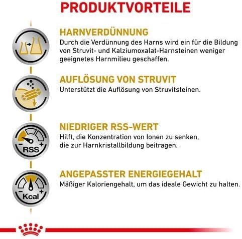 Royal Canin Urinary S/O Moderate Calorie е балансирана и богата на хранителни вещества формула, специално разработена да помогне на котки с проблеми с пикочните пътища, като струвитни кристали и камъни. Тази храна е подходяща за котки, които често преяждат. Този продукт е ветеринарна храна от серията Royal Canin Veterinary Health Nutrition. Ето защо е важно тази храна да се дава само по съвет на ветеринарен лекар. Това гарантира, че вашият домашен любимец получава точно необходимите му хранителни вещества. Всяка промяна в диетата трябва да се прави внимателно и постепенно в продължение на 7-10 дни. Обърнете внимание на правилния размер на порцията - особено при смесване на храни.